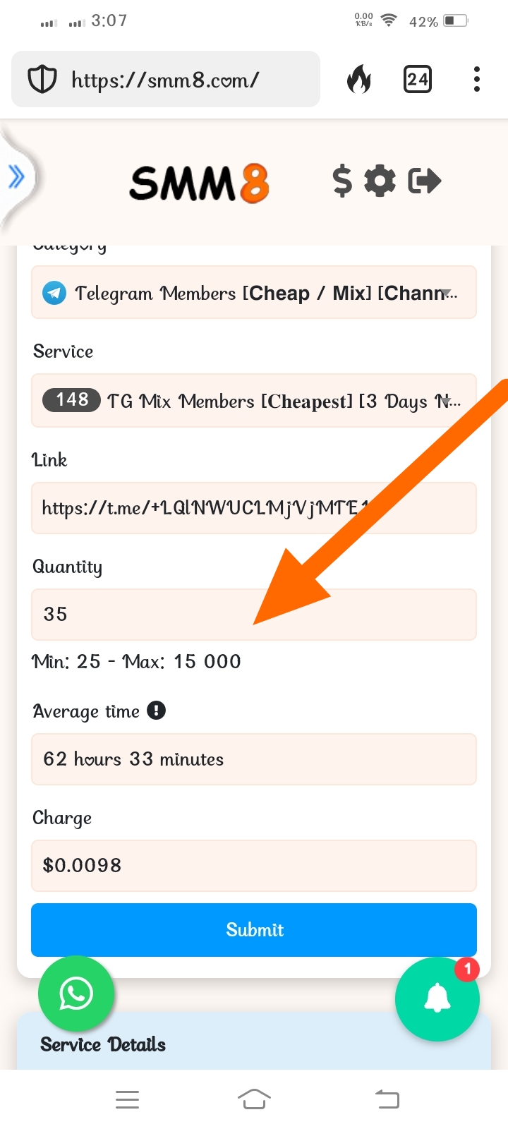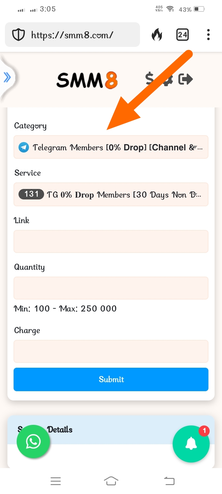 এখানে আপনার চ্যানেল লিংক বা পোস্টের লিংক দিন এবং ব্যালান্স অনুযায়ী Quantity সিলেক্ট করে Submit ক্লিক করুন।