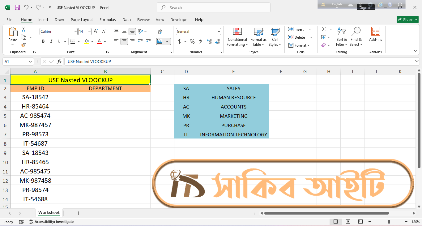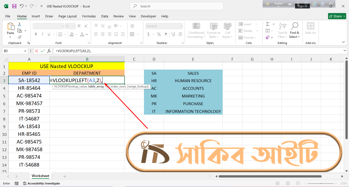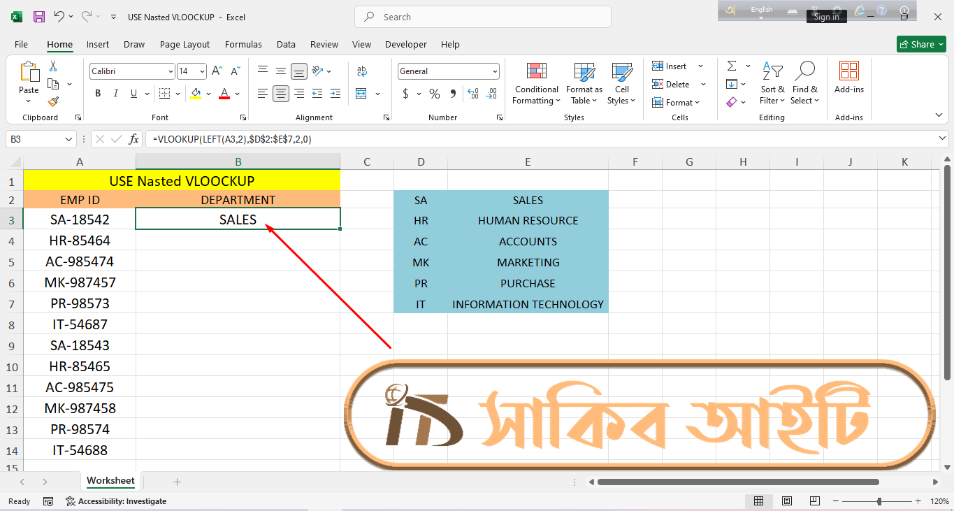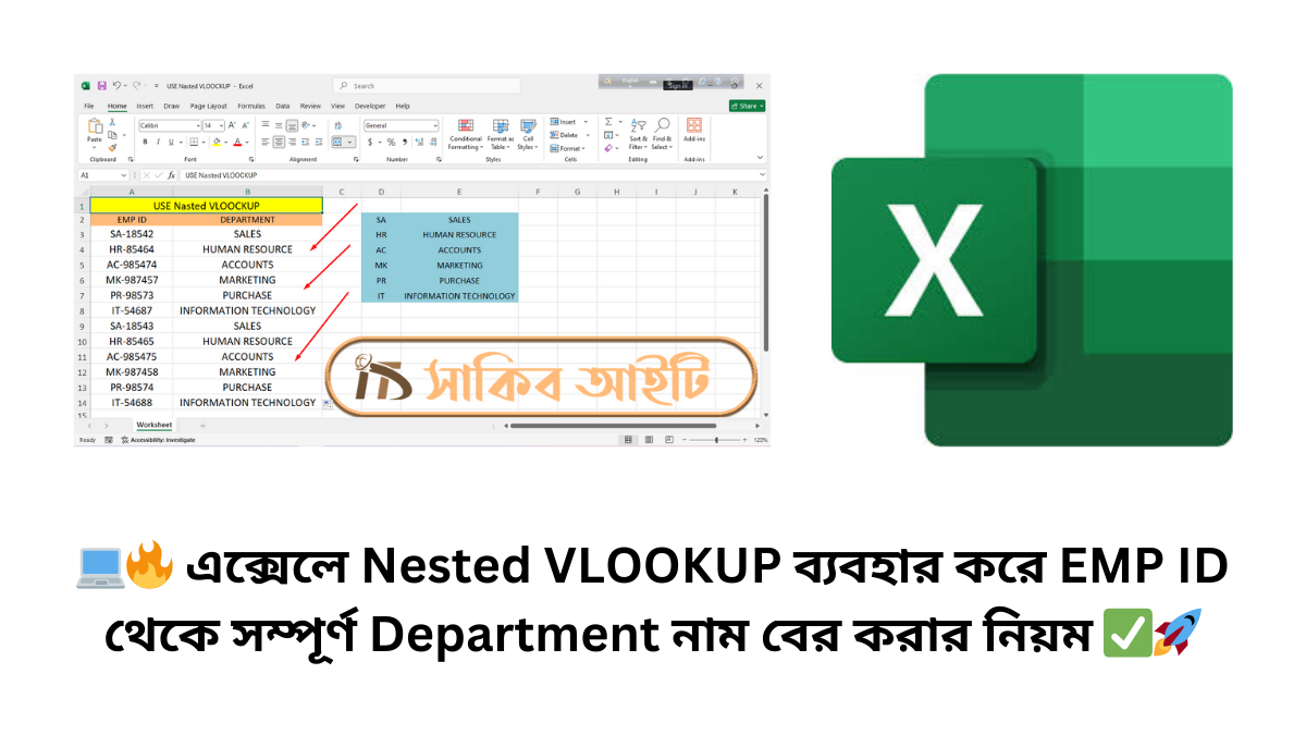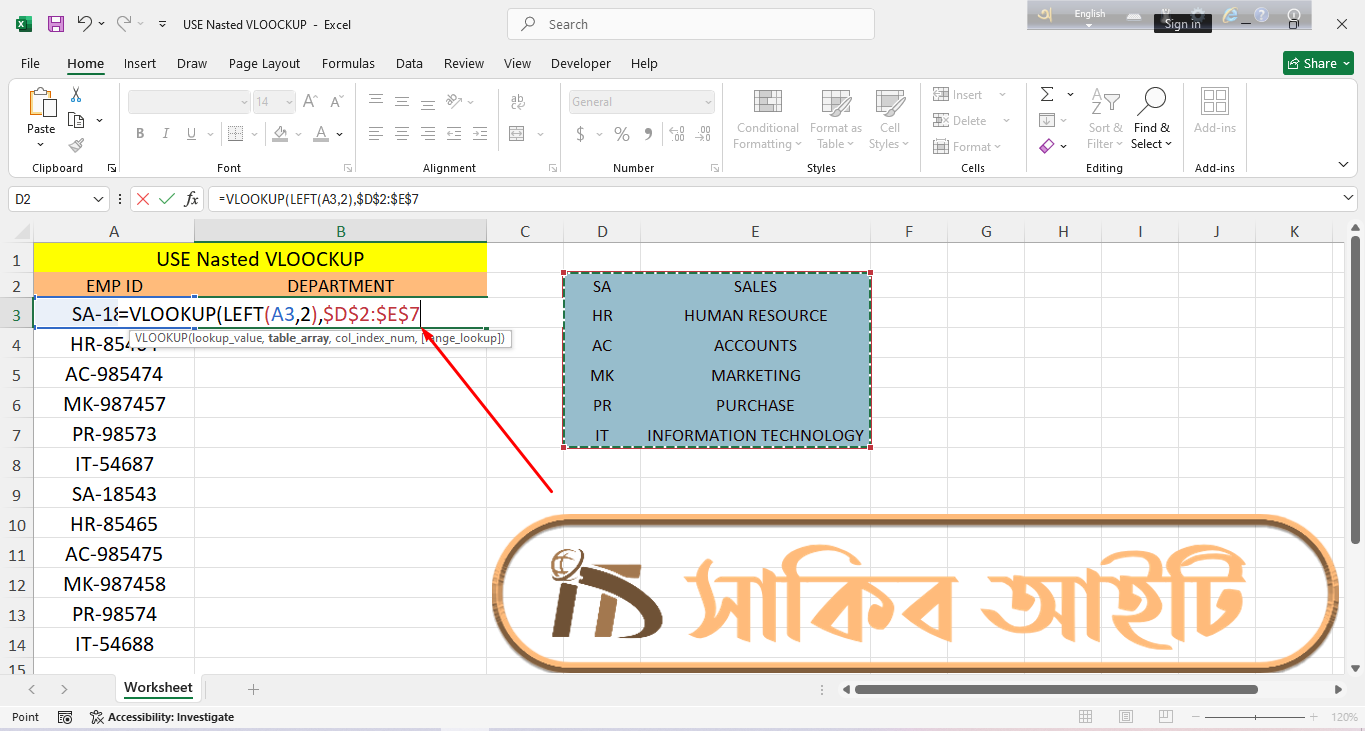 Microsoft Excel-āĻ āĻāĻžāĻ āĻāϰāĻžāϰ āϏāĻŽā§ āĻ āύā§āĻ āϏāĻŽā§ āĻāĻŽāĻžāĻĻā§āϰ āĻĄāĻžāĻāĻžāϰ āĻā§āϤāϰ āĻĨā§āĻā§ āύāĻŋāϰā§āĻĻāĻŋāώā§āĻ āϤāĻĨā§āϝ āĻāϞāĻžāĻĻāĻž āĻāϰ⧠āĻāύāϤ⧠āĻšā§āĨ¤ āĻŦāĻŋāĻļā§āώ āĻāϰ⧠āĻā§āύ⧠āĻāϰā§āĻŽāĻāĻžāϰā§āϰ EMP ID āĻāϰ āϏāĻžāĻĨā§ āϝā§āĻā§āϤ āϏāĻāĻā§āώāĻŋāĻĒā§āϤ āύāĻžāĻŽ (āϝā§āĻŽāύāĻ SA, HR, AC) āĻĨā§āĻā§ āϤāĻžāϰ āϏāĻŽā§āĻĒā§āϰā§āĻŖ āĻŦāĻŋāĻāĻžāĻā§ā§ āύāĻžāĻŽ (Department Name) āĻŦā§āϰ āĻāϰāĻž āĻā§āĻŦ āĻā§āϰā§āϤā§āĻŦāĻĒā§āϰā§āĻŖ āĻāĻāĻāĻŋ āĻāĻžāĻāĨ¤ āĻšāĻžāϤ⧠āĻāϰ⧠āϞāĻŋāĻā§ āĻĻā§āĻā§āĻž āϏāĻŽā§āĻāĻŦ āĻšāϞā§āĻ āĻŦā§ āĻĄāĻžāĻāĻžāϏā§āĻā§ āϏā§āĻāĻž āĻ āύā§āĻ āϏāĻŽā§āϏāĻžāĻĒā§āĻā§āώ āĻšā§ā§ āϝāĻžā§āĨ¤ āĻ āϧāϰāύā§āϰ āϏāĻŽāϏā§āϝāĻžāϰ āϏāĻŽāĻžāϧāĻžāύ āĻāϰāϤ⧠āĻāĻŽāϰāĻž āĻŦā§āϝāĻŦāĻšāĻžāϰ āĻāϰāϤ⧠āĻĒāĻžāϰāĻŋ Nested VLOOKUP FormulaāĨ¤