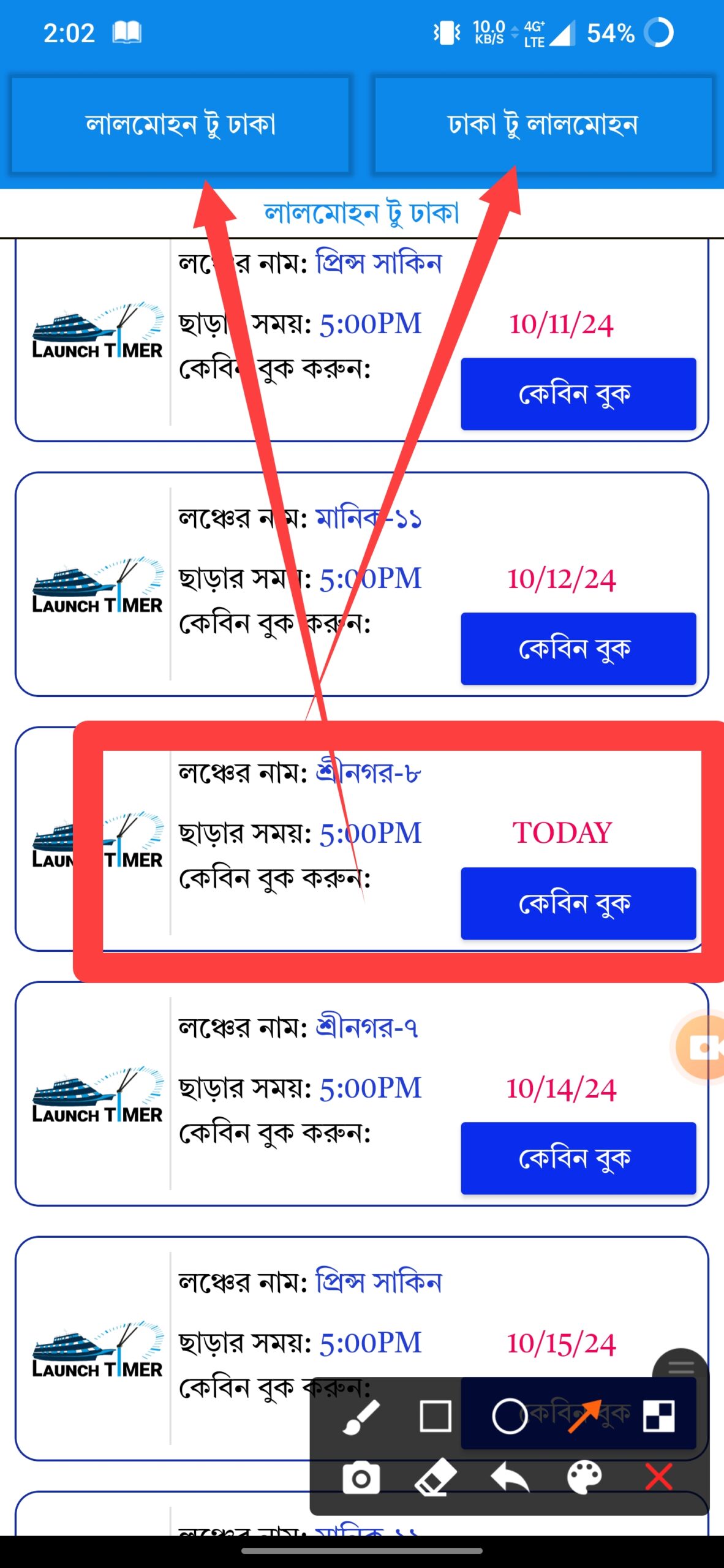 এখানে আপনি দেখুন “ঢাকা থেকে আপনার ঘন্তব্য ” বা “ঘন্তব্য থেকে ঢাকা ” সিলেক্ট করুন। এবং তারিখ অনুযায়ী সিডিউল দেওয়া আছে। তারিখ প্রথমে — (মাস-দিন-বছর) । এবং কেবিন বুক এ ক্লিক করলে কেবিন বুকিং হট নাম্বার পেয়ে যাবেন।