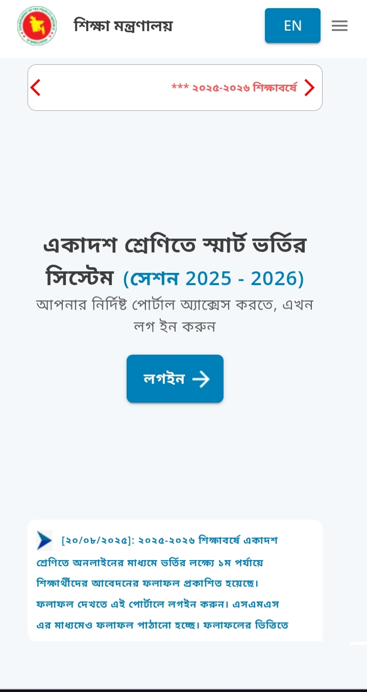 ২০২৫-২৬ শিক্ষাবর্ষে উচ্চ মাধ্যমিক স্তরে সরকারি-বেসরকারি কলেজে একাদশ শ্রেণীতে ভর্তির প্রথম পর্যায়ে নির্বাচিত শিক্ষার্থীদের ফলাফল প্রকাশ হয়েছে।