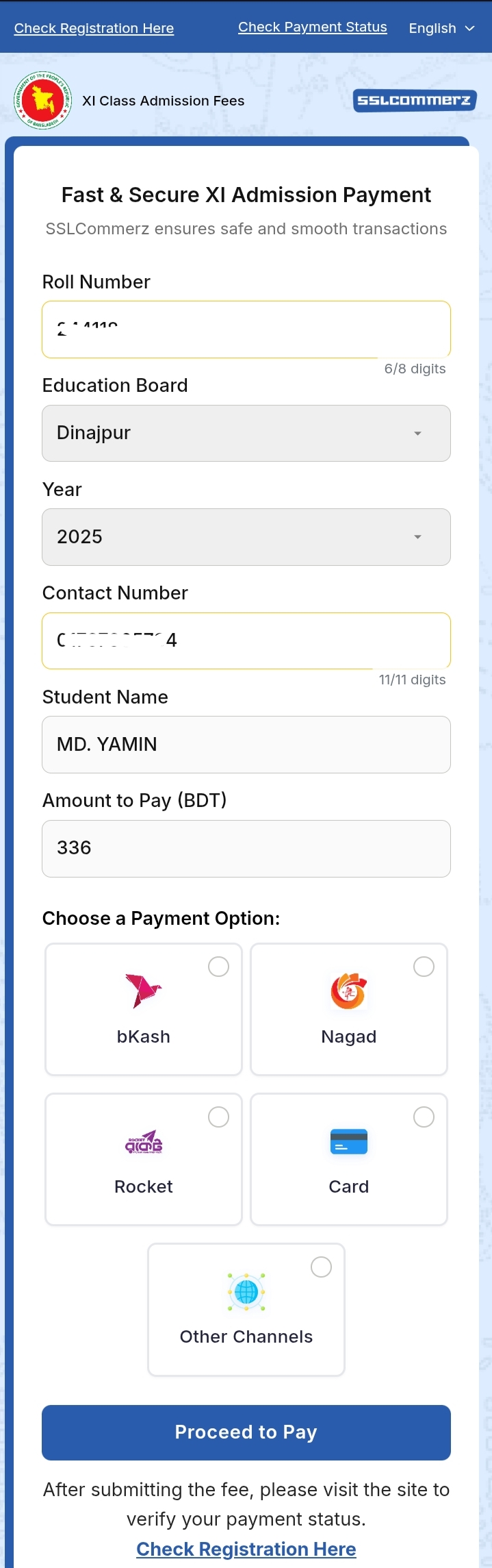 তার উপরের সবকিছু তথ্য সঠিকভাবে প্রদান করলেই স্টুডেন্টের নাম চলে আসবে এবং কিসের মাধ্যমে নিশ্চায় ফির পেমেন্ট প্রদান করবেন তা সিলেক্ট করে দিয়ে Proceed to pay তে ক্লিক করুন.!