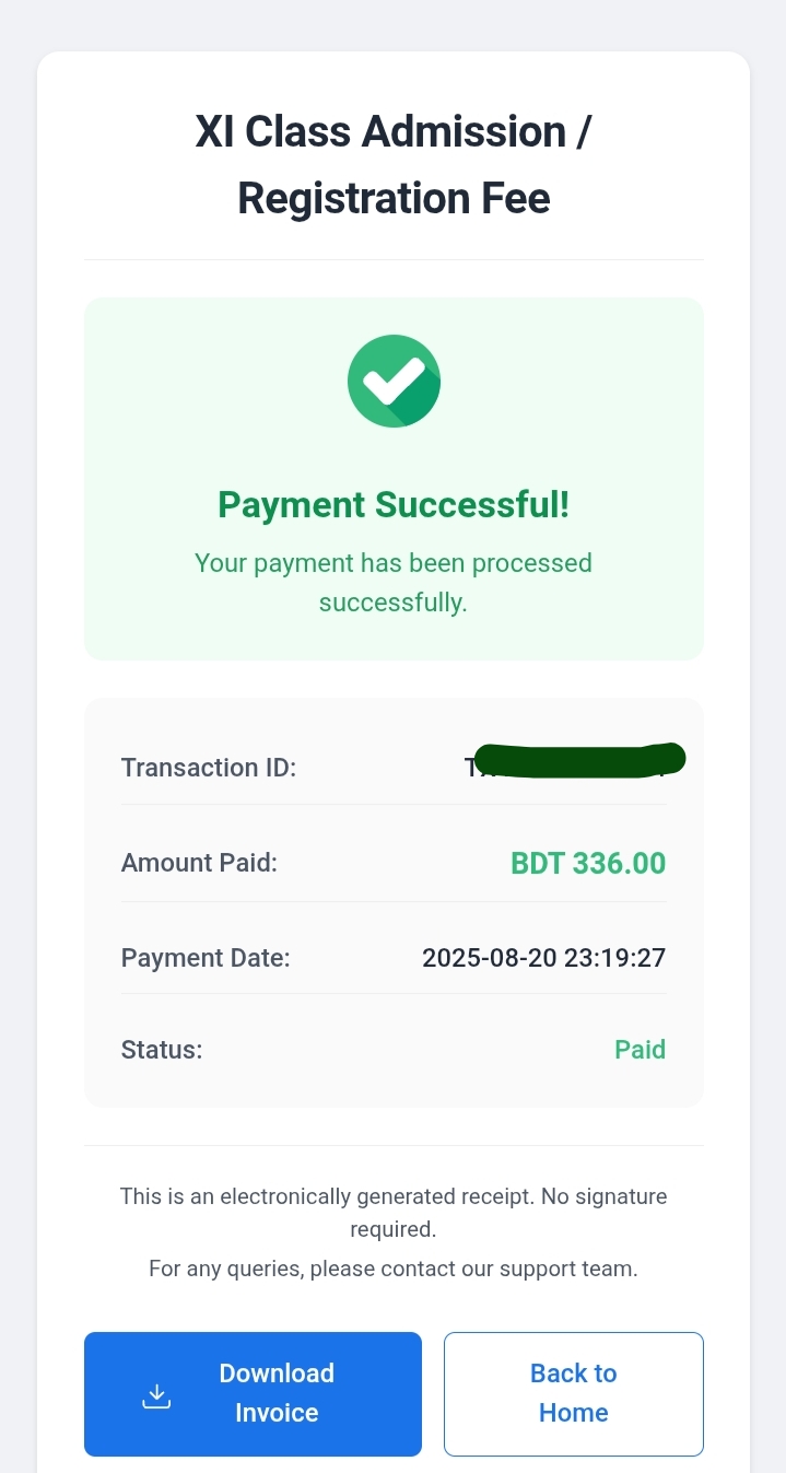 নিশ্চায় ফির পেমেন্ট প্রদান করা হলে একটি ডিজিটাল রিসিভ দিয়ে দিবে তাই ইচ্ছা করলে ডাউনলোড করে নিতে পারেন।