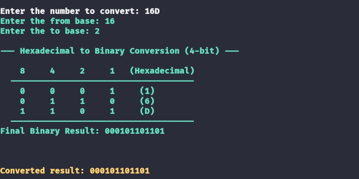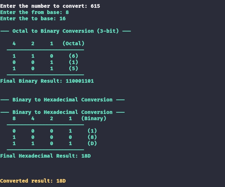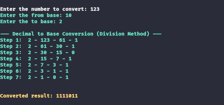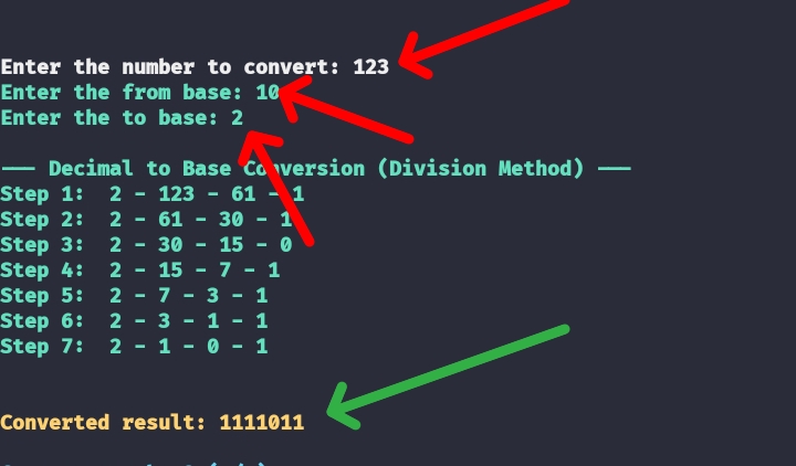- Decimal to Binary, Octal, Hexadecimal: ডেসিমাল (১০) সংখ্যা কে বাইনারি(২)/অক্ট্যাল(৮)/হেক্সাডেসিমাল(১৬) এর বেজ দিয়ে ভাগ করে ।