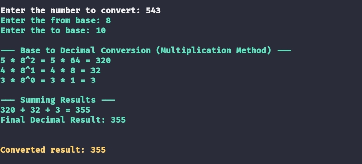 - Binary, Octal , Hexadecimal to Decimal: যে বেজ থেকে করতে হবে সেটি দিয়ে প্রত্যেক সংখ্যা কে গুণ করে এবং ক্রোম অনুযায়ী বেজ গুলোর পাওয়ার করে ।