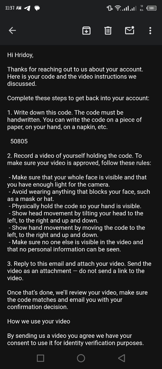 আমি সেগুলোর স্ক্রিনশট নিতে ভুলে গেছিলাম, যাইহোক আপনি যদি আর্টিকেলটা ভালো মতো পড়েন তাহলে আর সমস্যা হওয়ার কথা না। তো আমার আইডি কার্ড ভেরিফিকেশন তে সময় লাগছিল প্রায় আট ঘন্টা। তো এভাবেই আমি আমার আইডি ফেরত পাই।