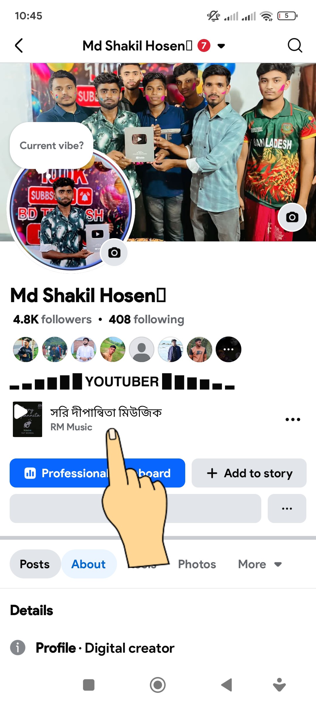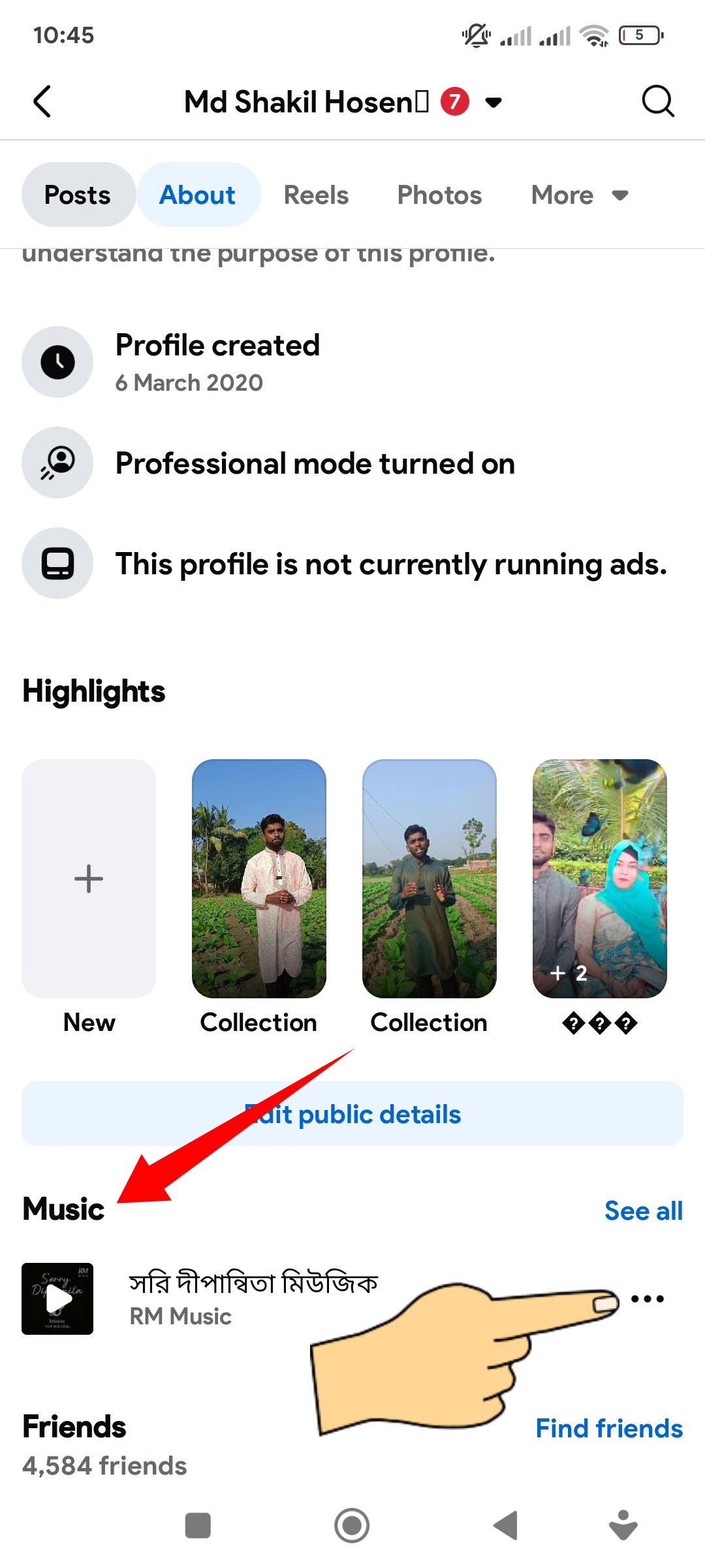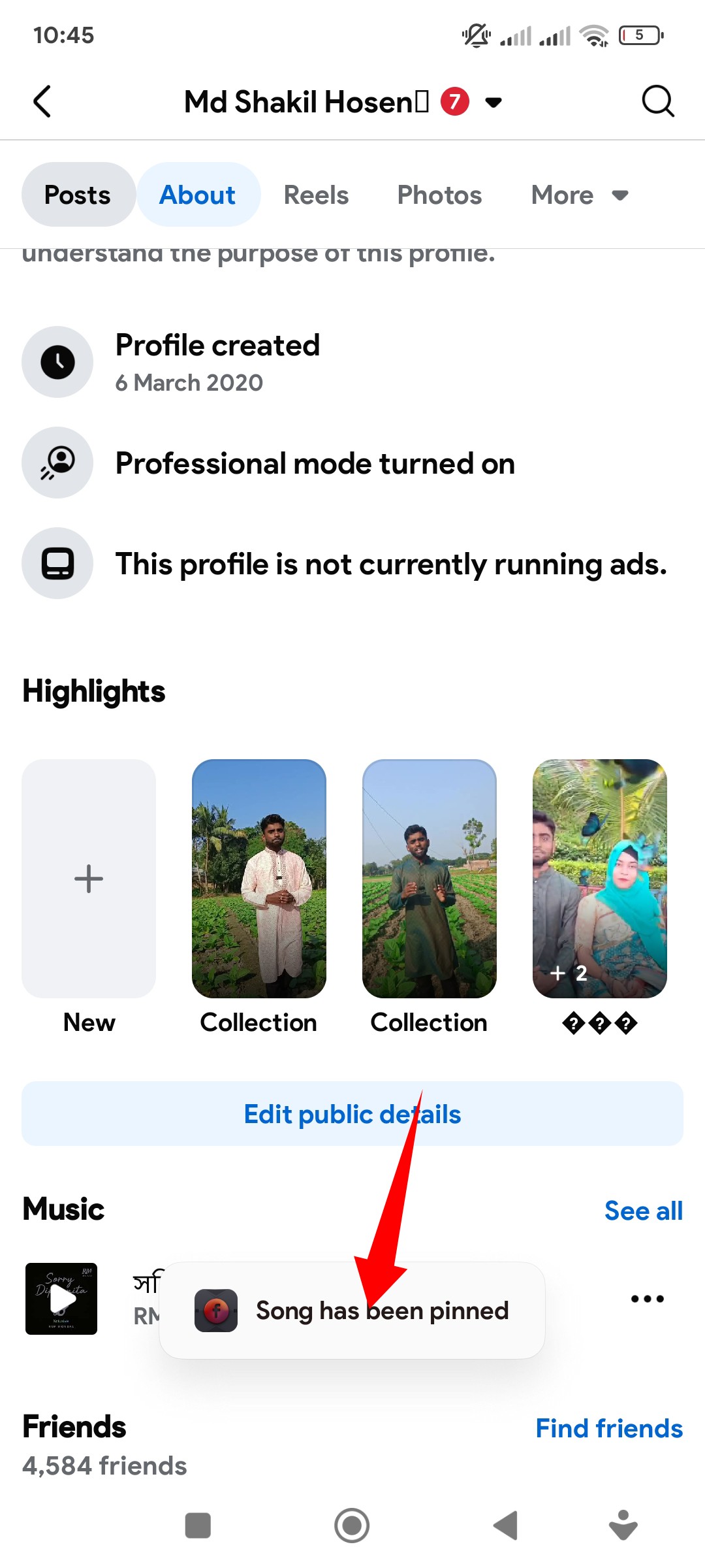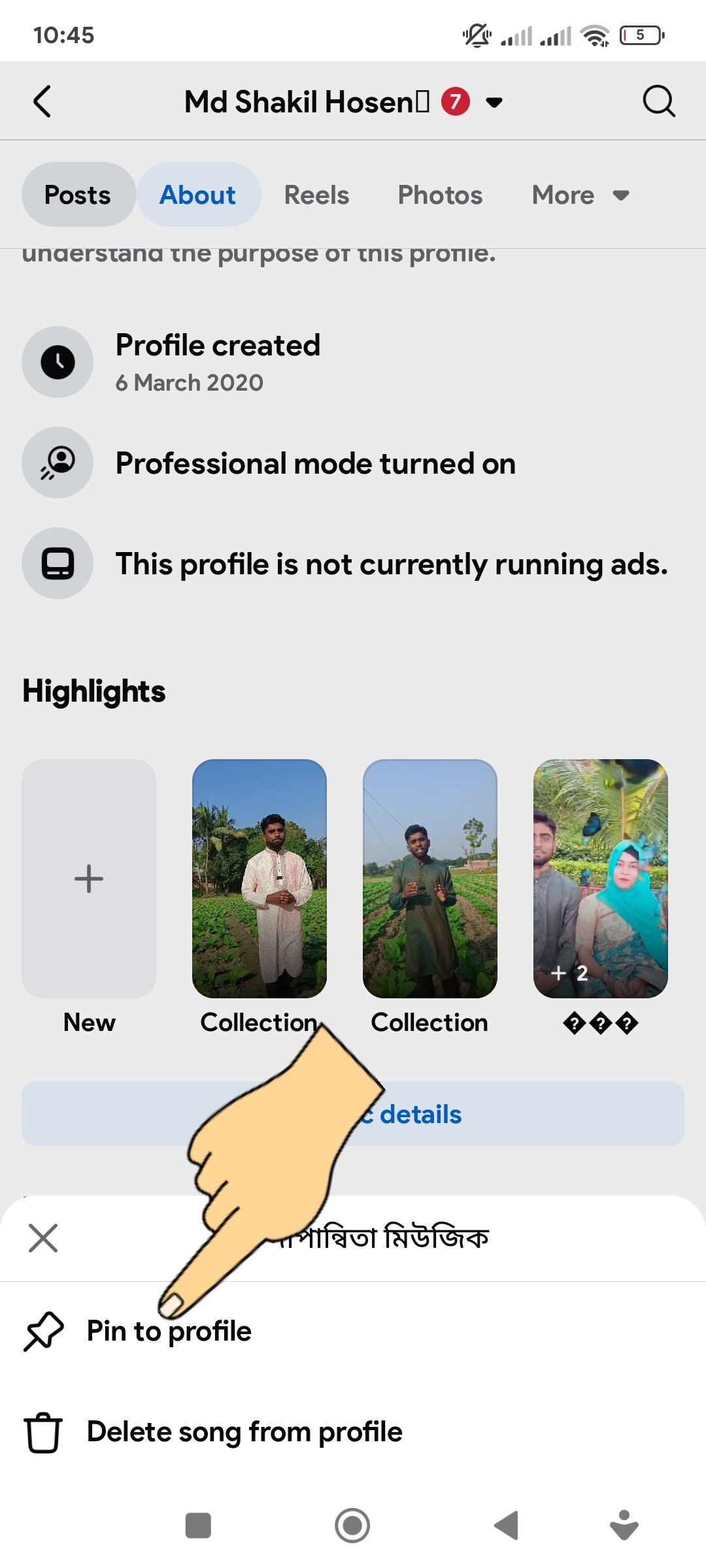 এবার দেখুন গানটি About মধ্যে নিচে রয়েছে তবে গানটি প্রোফাইল নামের কাছে আনতে ৩ ডটে ক্লিক করুন।