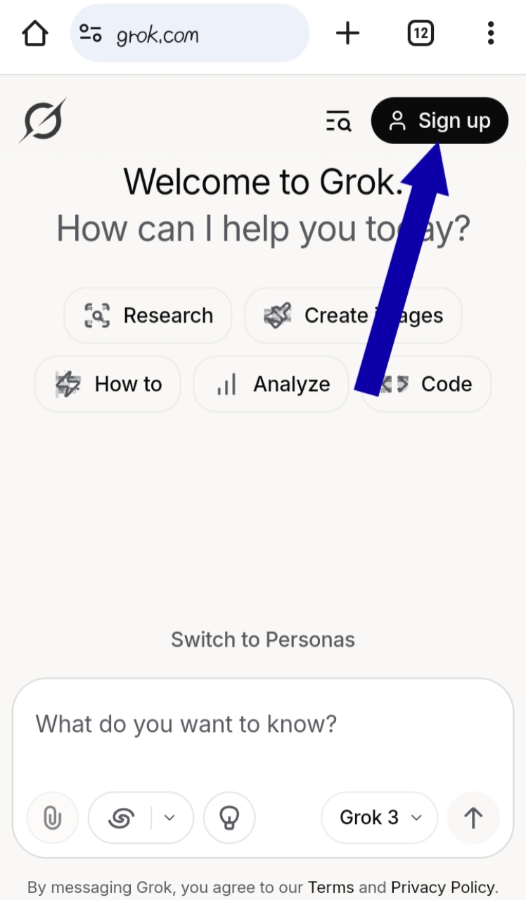 ১. প্রথমেই আপনারা Grok.com এই ওয়েবসাইটে চলে যান। এটা মূলত একটি AI বেসড ওয়েবসাইট। এটা অনেকটা Chatgpt এর মতো কাজ করে। বলতে পারেন Chatgpt এর কপি ভার্সন। তো যাই হোক, এই ওয়েবসাইটে চলে যান। গেলে নিচের মতো ইন্টারফেজ পাবেন। সেখান থেকে Sign up বাটনে ক্লিক করে দিন।