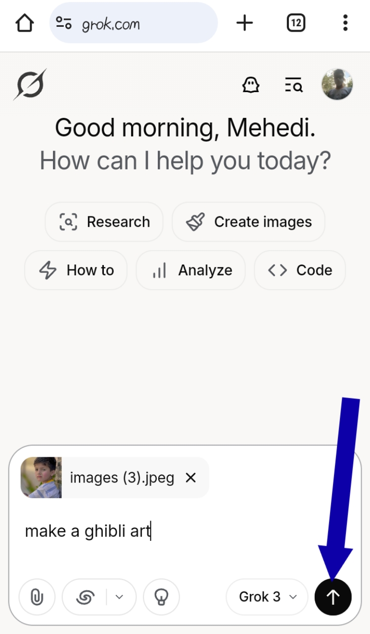 ৫. তারপর আপনার ফোনের গ্যালারি তে নিয়ে গেলে, যে ছবিতে ghibli art ইফেক্ট এড করতে চান সেটা সিলেক্ট করে দিবেন। এরপর ছবি সম্পূর্ণ আপলোড হলে আমার মতো করে promt দিয়ে সেন্ড করে দিবেন। promt টা আমি নিচে লিখে দিচ্ছি, চাইলে কপি করে নিতে পারেন।