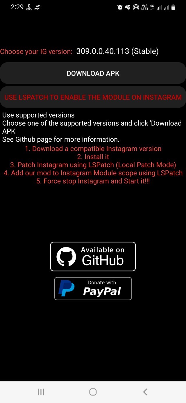 – অ্যাপটি ইন্সটল করার পর, কম্পিটিবল ইন্সটাগ্রাম ডাউনলোড করুন এবং LS Patch দিয়ে প্যাচ করুন। এরপর প্যাচ করা ইনস্টাগ্রাম ইনস্টল করে হোম বাটনে টিপ দিয়ে ধরে রাখলে ডেভেলপার অপশন পেয়ে যাবেন।
