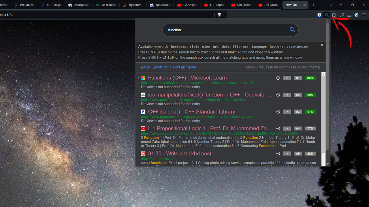 তবে ট্যাব সার্চ আরো পাওয়ারফুল করতেই এই এক্সটেনশনের উদ্ভব। এটা সব ট্যাবের কনটেন্ট ইনডেক্স করে রাখে বিধায় কিওয়ার্ড ম্যাচ করে তড়িৎ রেজাল্ট বের করে ফেলে।