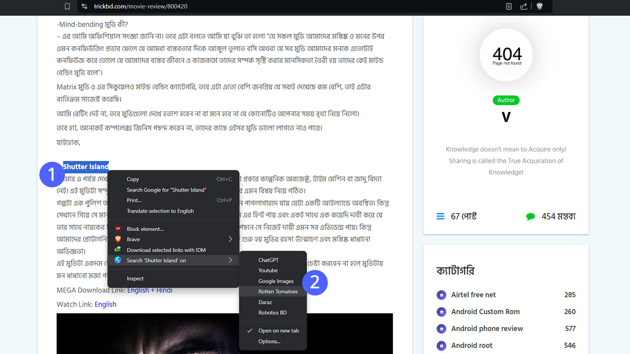 মানে ধরুন আপনি কোথাও দেখলেন শাটার আইল্যান্ড অনেক দারুন একটা মুভি। তো আপনি “shutter island” লেখাটি সিলেক্ট করে মাউসের কনটেক্স মেনু থেকে সরাসরি রোটেন টমেটো সিলেক্ট করতে পারবেন। তখন নতুন ট্যাবে রোটেন টমেটো লোড হবে শাটার আইল্যান্ড সার্চ সহ।