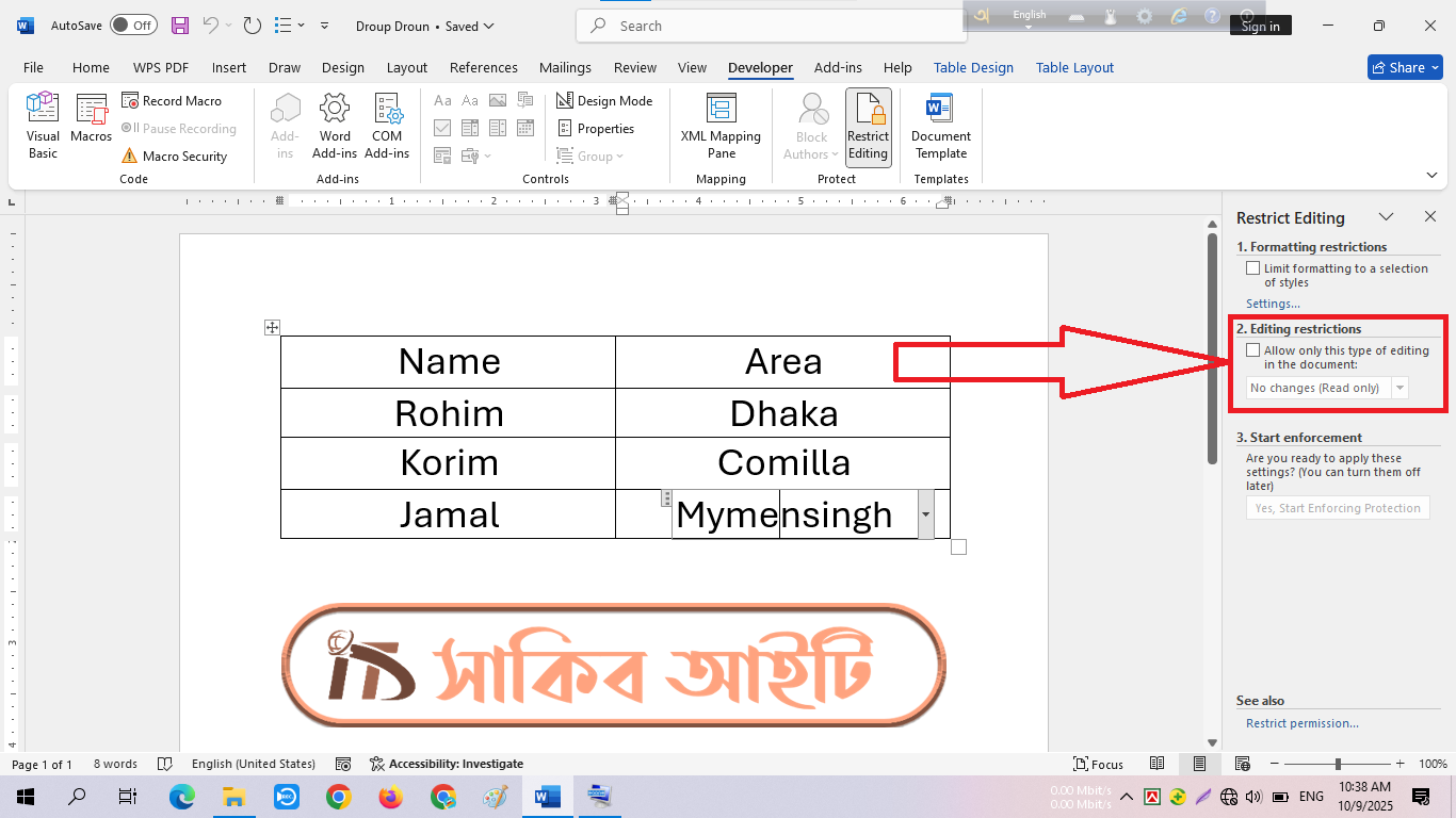 āϤāĻžāϰāĻĒāϰ Restrict Editing āĻĒā§āϝāĻžāύā§āϞ⧠Editing restrictions āĻ āĻāĻŋāĻ āĻĻāĻŋāύāĨ¤