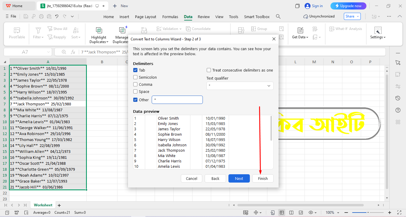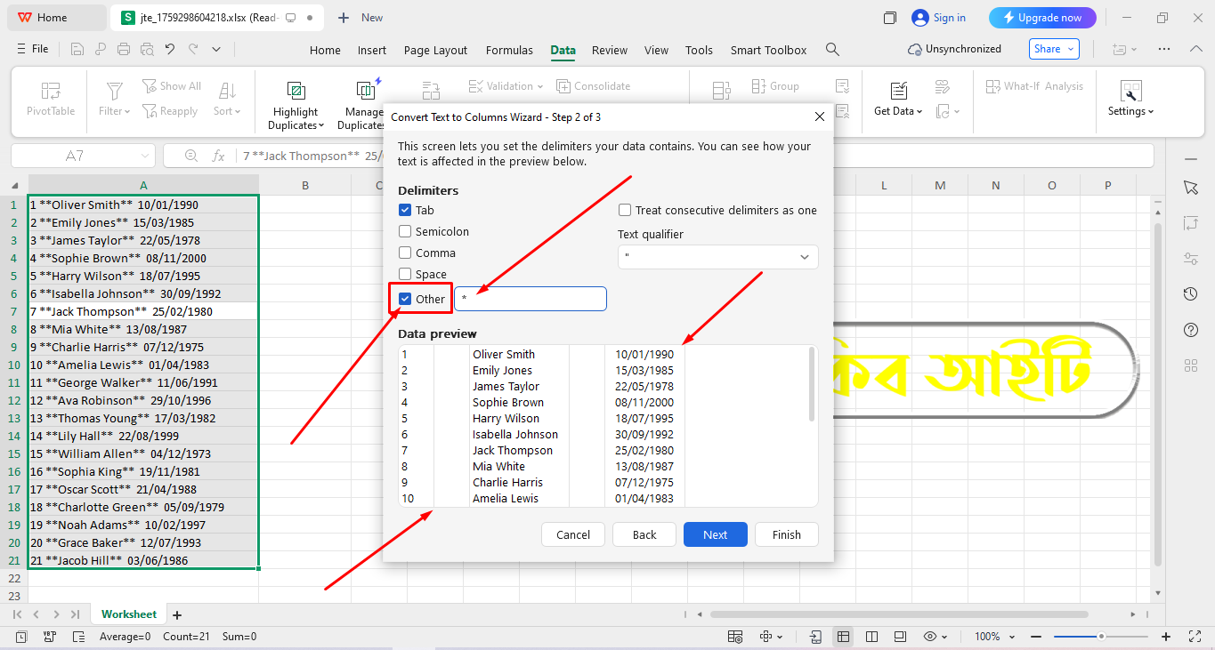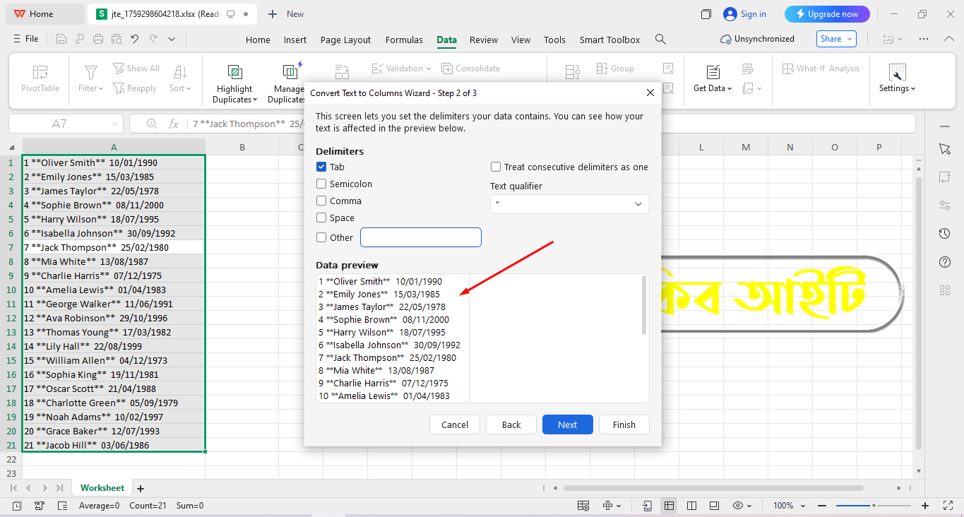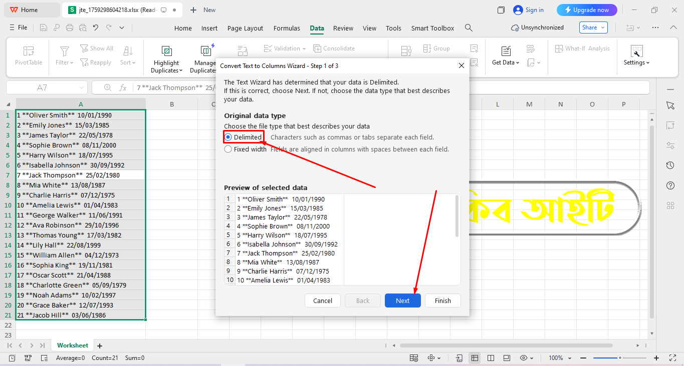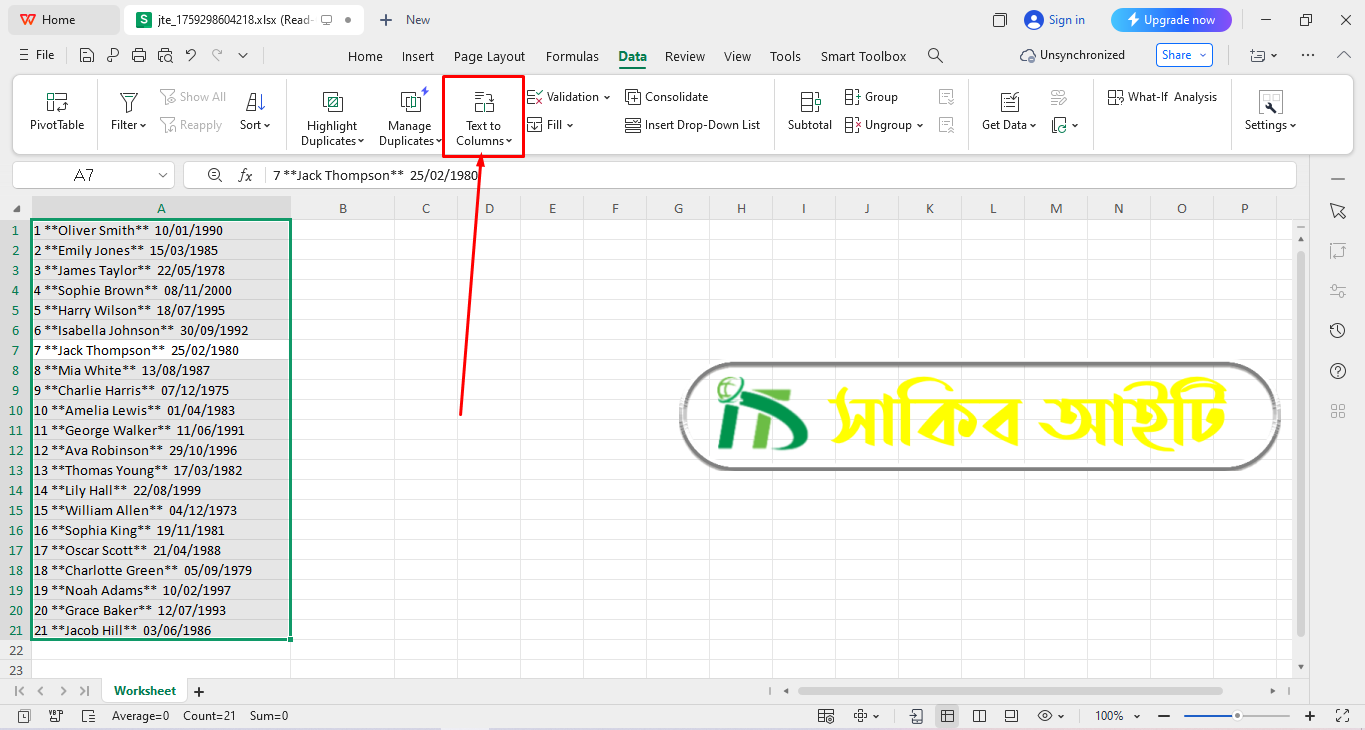 Microsoft Excel āĻ WPS Office āĻ āϏāĻŦāĻā§ā§ā§ āĻāύāĻĒā§āϰāĻŋā§ āĻāĻŦāĻ āϏāĻšāĻ āĻāĻĒāĻžā§ āĻšāϞ⧠Text to Columns āĻŦā§āϝāĻŦāĻšāĻžāϰ āĻāϰāĻžāĨ¤ āĻĻā§āĻā§āύ āĻāĻŽāĻžāϰ Worksheet āĻāĻāĻāĻŋ āĻāϞāĻžāĻŽā§ Serial Number, Name āĻāϰ Date āϰāϝāĻŧā§āĻā§āĨ¤
