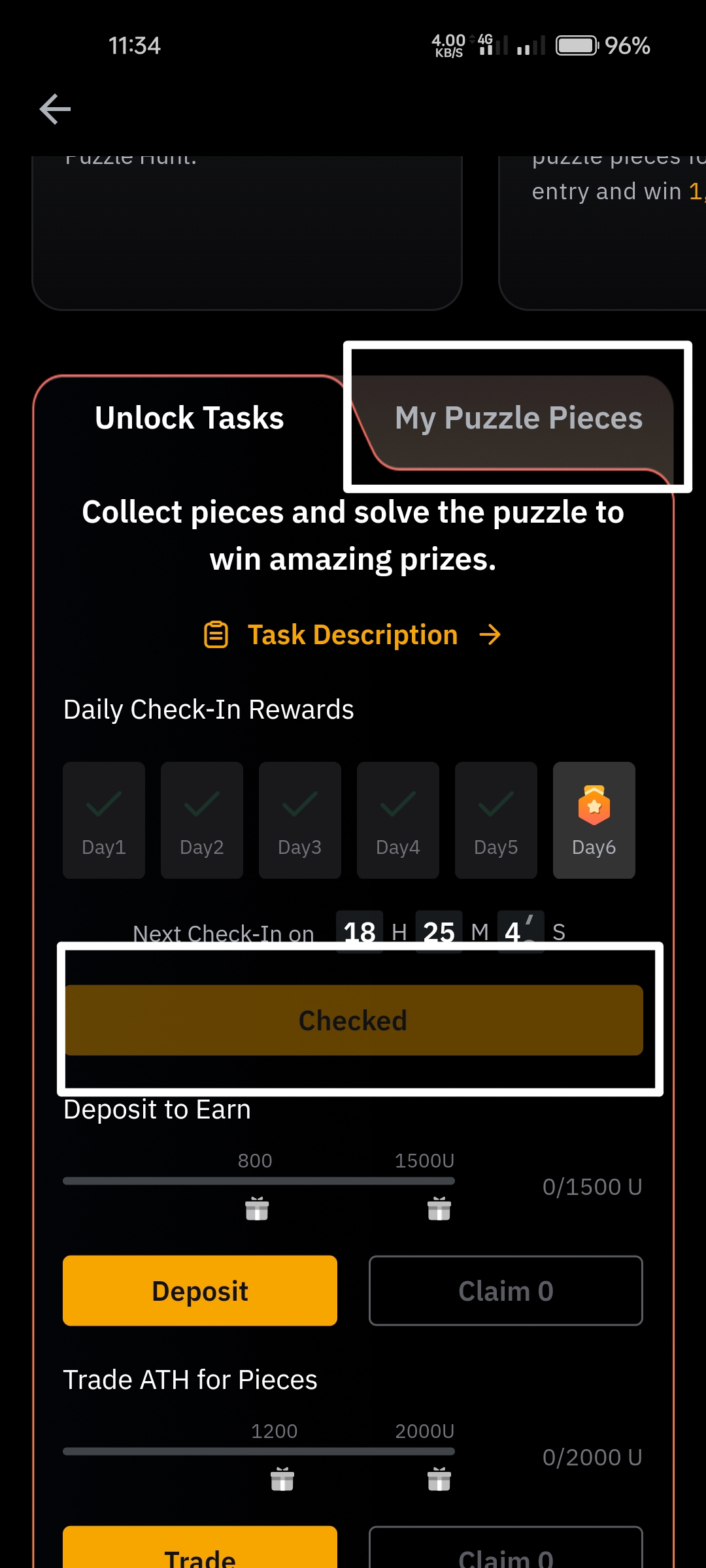 পরে নিচের দিকে আপনি Task দেখতে পারবেন সেগুলো পুরণ করলে এবং দৈনিক Check in ক্লিক করলে আপনি Puzzle পাবেন।