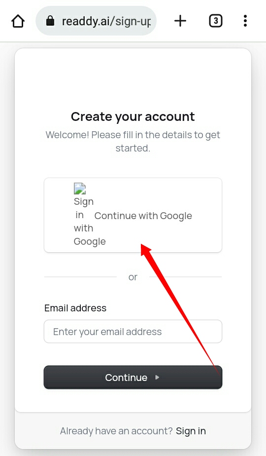 অ্যাকাউন্ট তৈরির জন্য গুগল এর Tempmail ব্যবহার করতে হবে, যাতে Sign in with google দিয়েই লগইন করা যায়। অন্য Tempmail দিলে হবে না তাই।