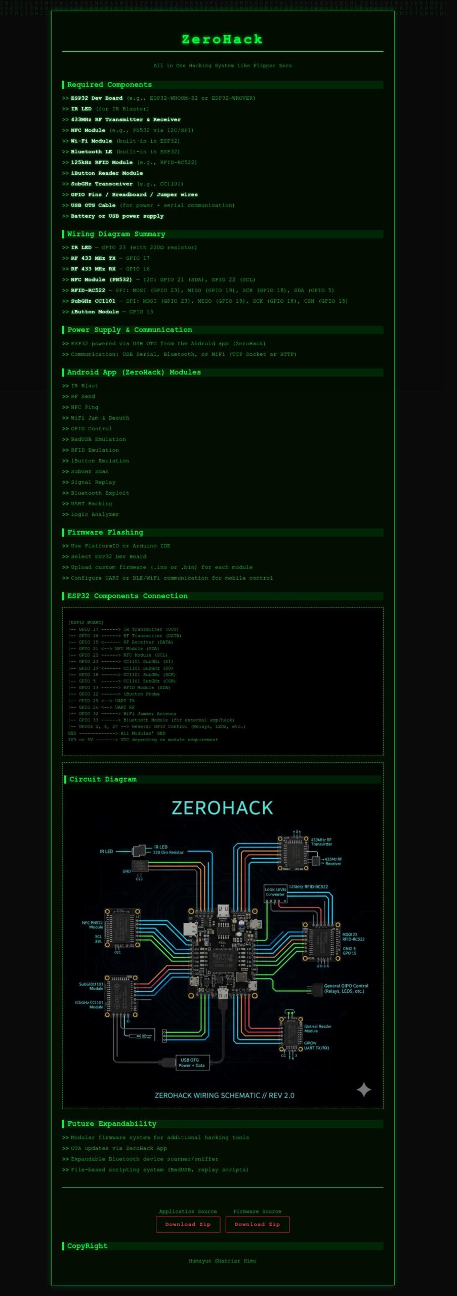 ESP32 হতে Flipper Zero তৈরীতে এই ZeroHack এর ফার্মওয়্যার এবং সফটওয়্যার প্রয়োজন প্রয়োজন হবে। যেহেতু এখানে কোন এক্সটার্নাল ডিসপ্লে (LCD) এবং কনট্রোল সুইচ ব্যবহার না করে সরাসরি এনড্রোয়েড ডিভাইসের মাধ্যমেই কনট্রোল এবং হ্যাকিং এক্টিভিটি করবো তাই ESP32 তে FlipperZero এর ফার্মওয়্যার আপডেট করতে হবে [আপনি চাইলে কম্পিউটার হতেও USB এর মাধ্যমে করতে পারেন / মোবাইল হতে করতে চাইলে OTG ব্যবহার করেও করতে পারেন]।