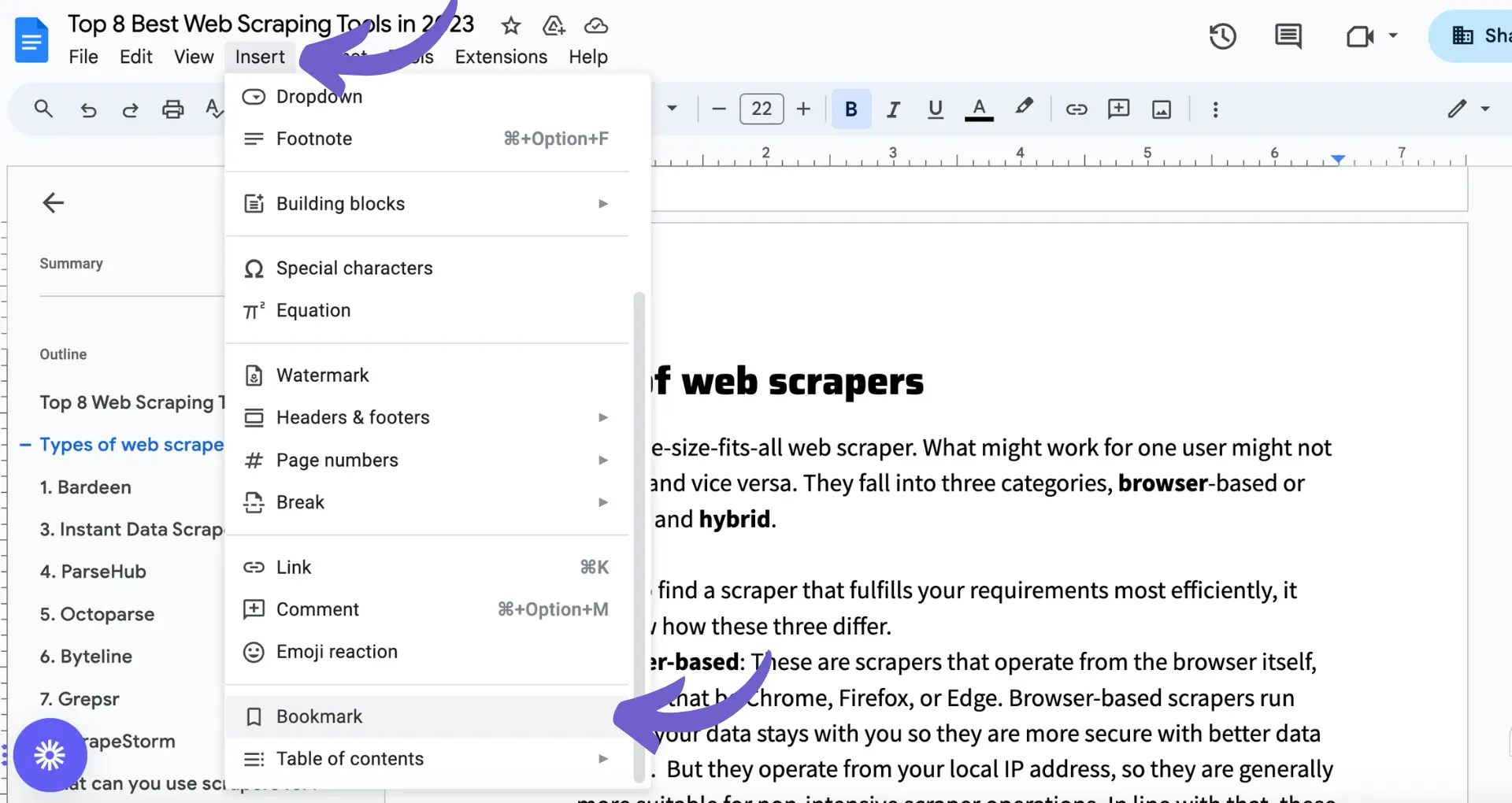 লম্বা ডকুমেন্টে বারবার স্ক্রল কইরা সময় নষ্ট হয়। গুগল ডকসের Bookmark ফিচার দিয়া নেভিগেট করা অনেক সহজ।
