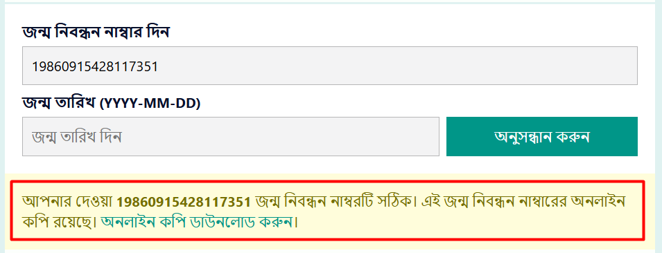 - ধাপ ৪ঃ সঠিক জন্ম নিবন্ধন নাম্বার প্রদান করে অনুসন্ধান করুন বাটনে ক্লিক করলে আপনার দেওয়া জন্ম নিবন্ধন নাম্বারের ফলাফল দেখতে পারবেন। জন্ম নিবন্ধন নাম্বার সঠিক হলে নিচের স্কিনশটের মতোন রেজাল্ট আসবে। সাথে আপনি জন্ম নিবন্ধন অনলাইন কপি ডাউনলোড করার অপশন পাবেন। তবে এক্ষেত্রে জন্ম তারিখের প্রয়োজন পড়বে।