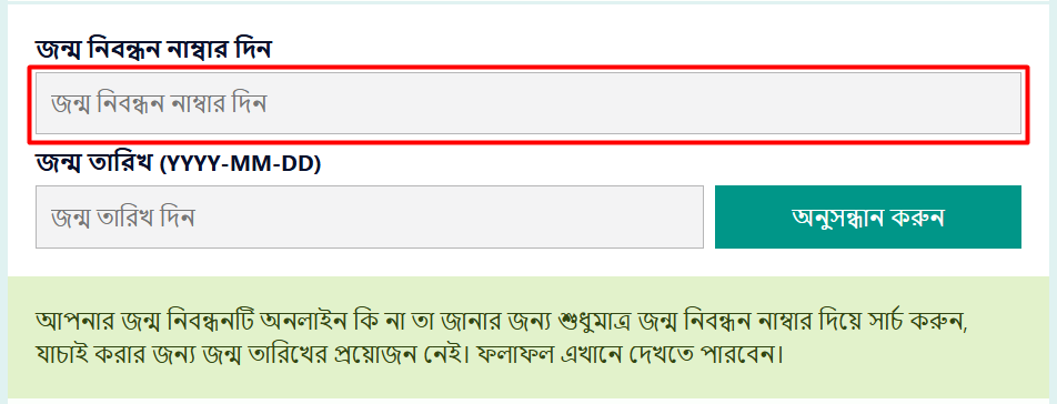 - ধাপ ২ঃ ওয়েবসাইটে প্রবেশ করার পর নির্ধারিত ঘরে আপনার জন্ম নিবন্ধন নাম্বার প্রবেশ করান। নিচের স্কিনশটের মতোন ইন্টারফেস দেখতে পারবেন। শুধুমাত্র জন্ম নিবন্ধন নাম্বার দিবেন। জন্ম তারিখ প্রদান করতে হবে না। জন্ম তারিখ দেওয়ার ইনপুট ফিল্ড ডিজাবল রয়েছে।