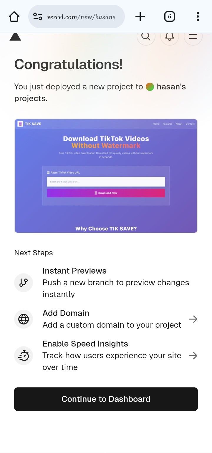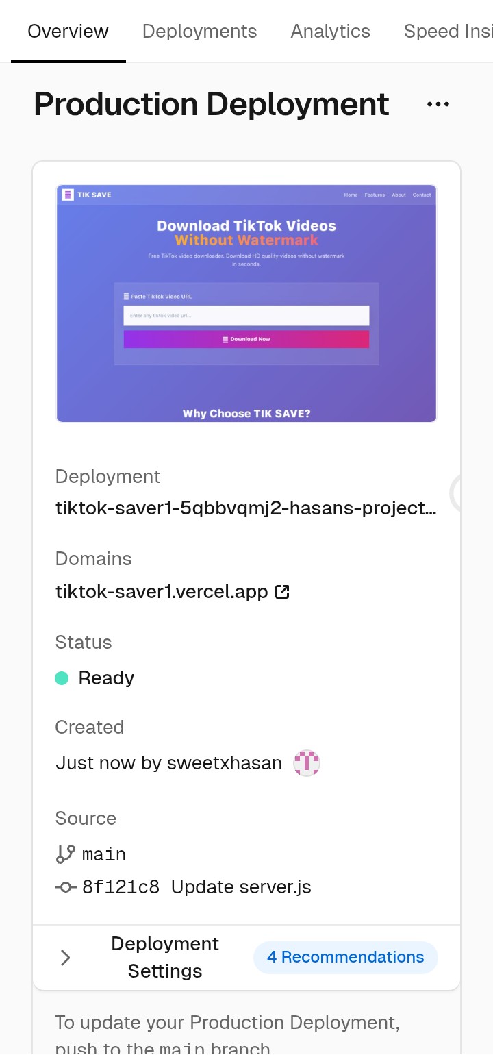 আর এটাতে নিজের Api ও তৈরি হবে তাই আগামিতে এটার Api ওয়েবসাইট বানাবো এতে Api আপনি নিজে ব্যবহার করতে পারবেন এবং সবাই ব্যবহার করতে পারবে সব জায়গায়। Telegram bot, Website tool যা ইচ্ছে! আগামিতে এটার ওয়েবসাইট তৈরি করে দিবো এখন Tiktok Video Downloder ওয়েবসাইট তৈরি করে দিলাম!