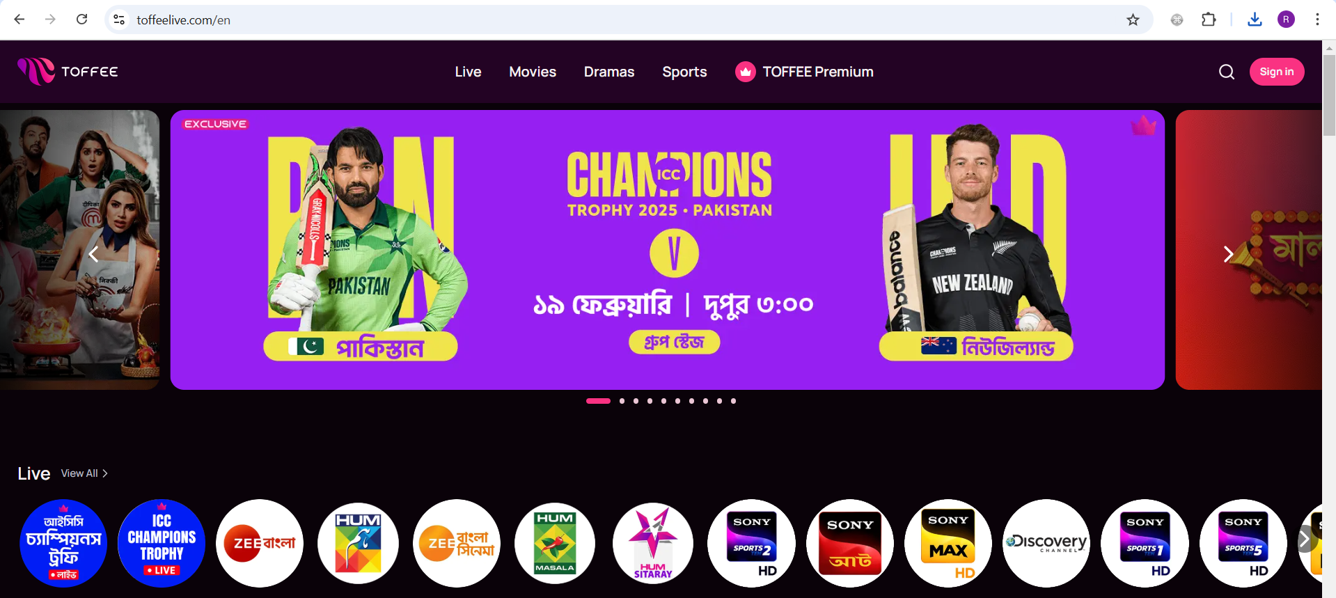 t sports প্রিমিয়াম নেয়ার অফিশিয়াল ওয়েবসাইট লিংক https://toffeelive.com/en