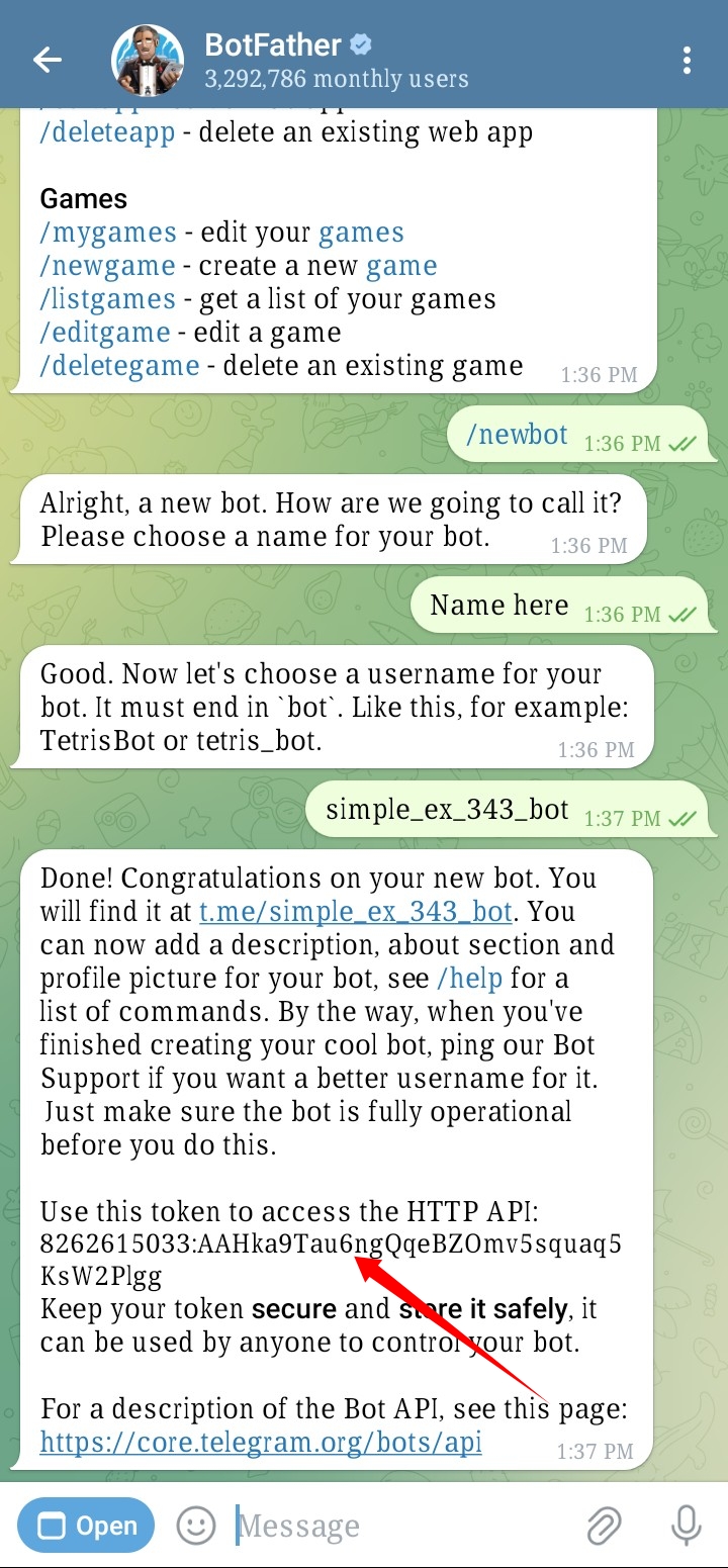 বট তৈরি হয়ে গেছে! এই api token টা কপি করে নিন! আর উপরে আপনার বট লিংক আছে!