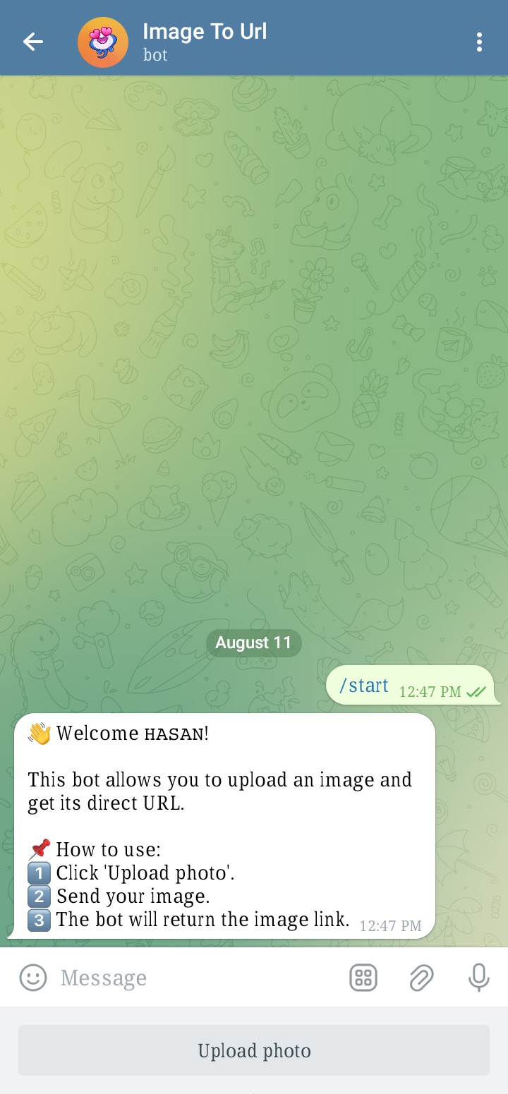 • Bot এ ফাস্ট এ Start করলে Wellcome করবে সাথে কিভাবে কি করতে হয় বলে দিবে! Upload Image মেনু সিস্টেম আছে