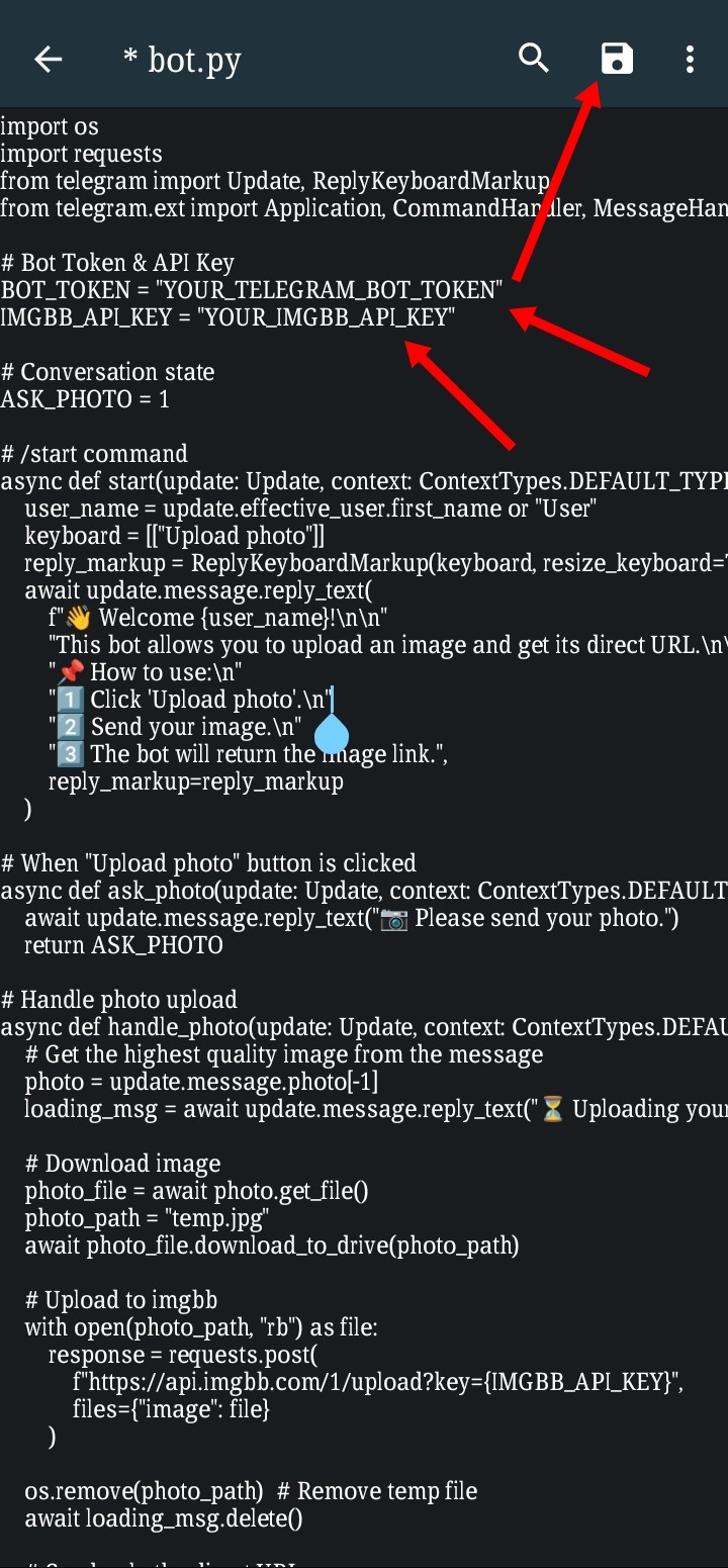 কোডের উপরে এটিতে Bot token এবং Imgbb Api key টা পেস্ট করে দিন! যেগুলো কপি করতে বলেছিলাম! তারপর সেভ করুন