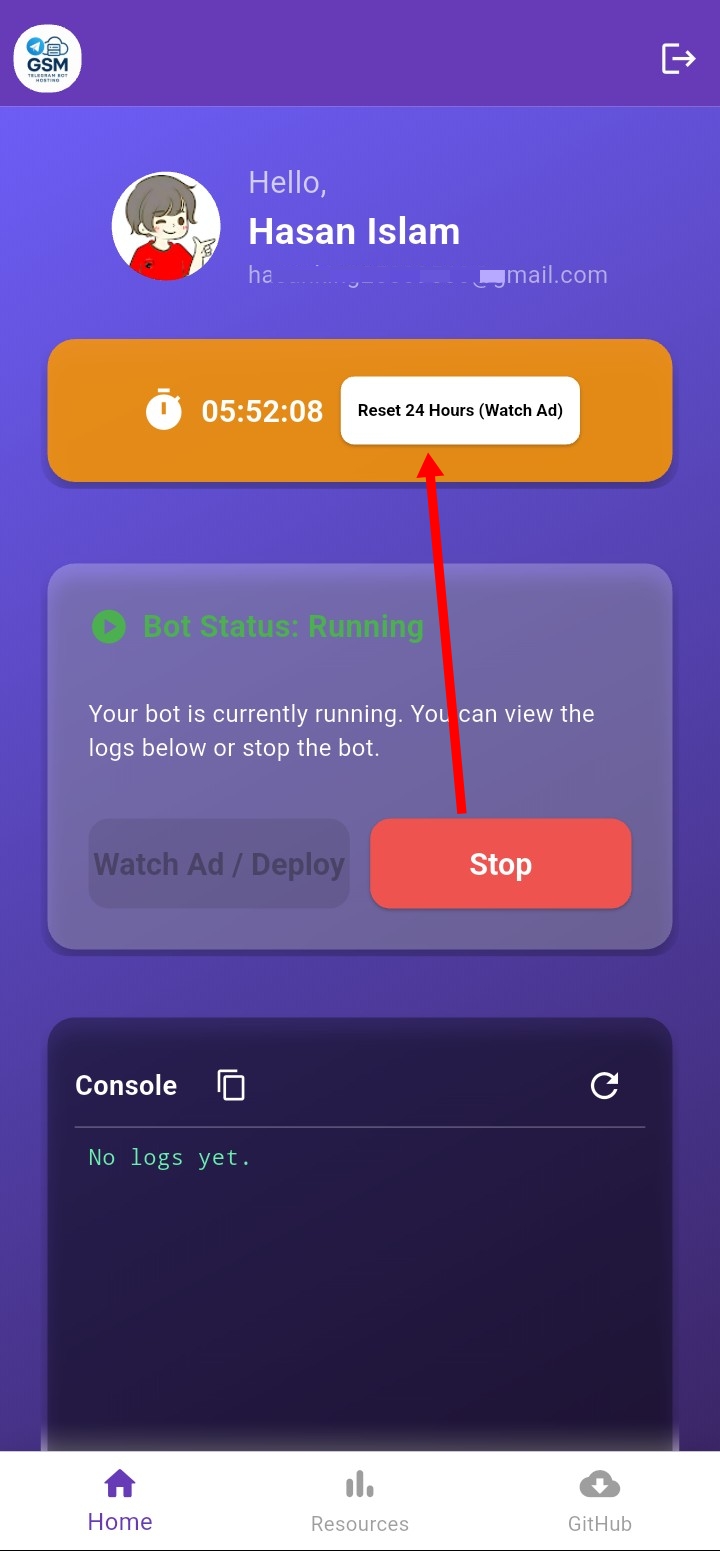 Telegram free hosting অ্যাপ এ 24 ঘন্টা রান করবে ২৪ ঘন্টা আবার সেট করতে 24 টাইম শেষ হওয়ার আগেই একটি Ads দেখে আবার ঠিক রাখতে পারবেন এতে করে সব সময় বট চালু থাকবে!