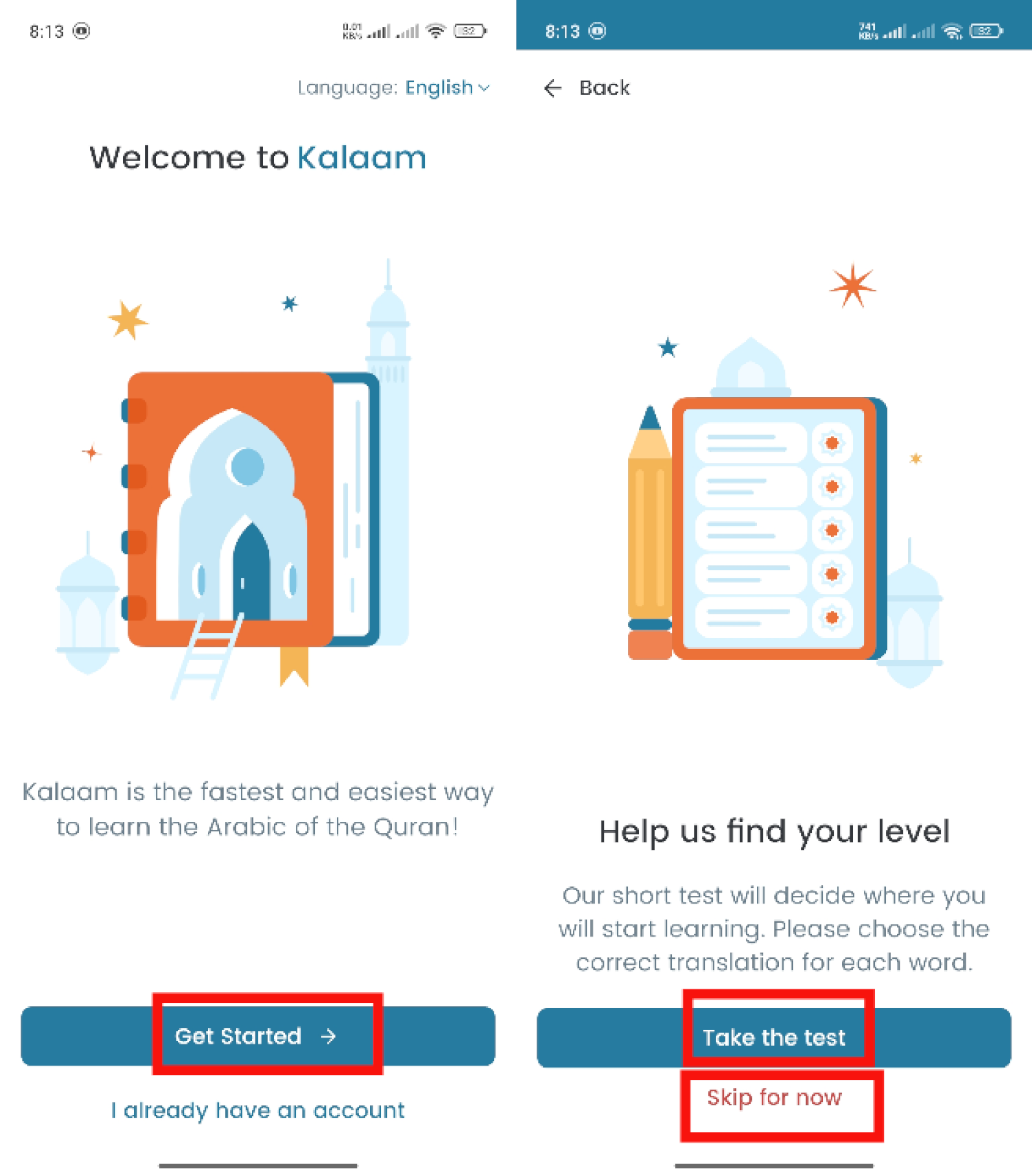 প্রথমত উপরের লিঙ্ক থেকে অ্যাপটি ডাউনলোড করুন এবং ওপেন করুন। তাহলে নিচের মতো ওয়েলকাম স্ক্রিন দেখতে পাবেন। এখন গেট স্টারটেড তারপরে একটি টেস্ট দিতে বলবে আপনি কিছুটা আরবি জানলে টেস্ট দিতে পারেন অন্যথায় স্কিপ করলেও সমস্যা নেই।