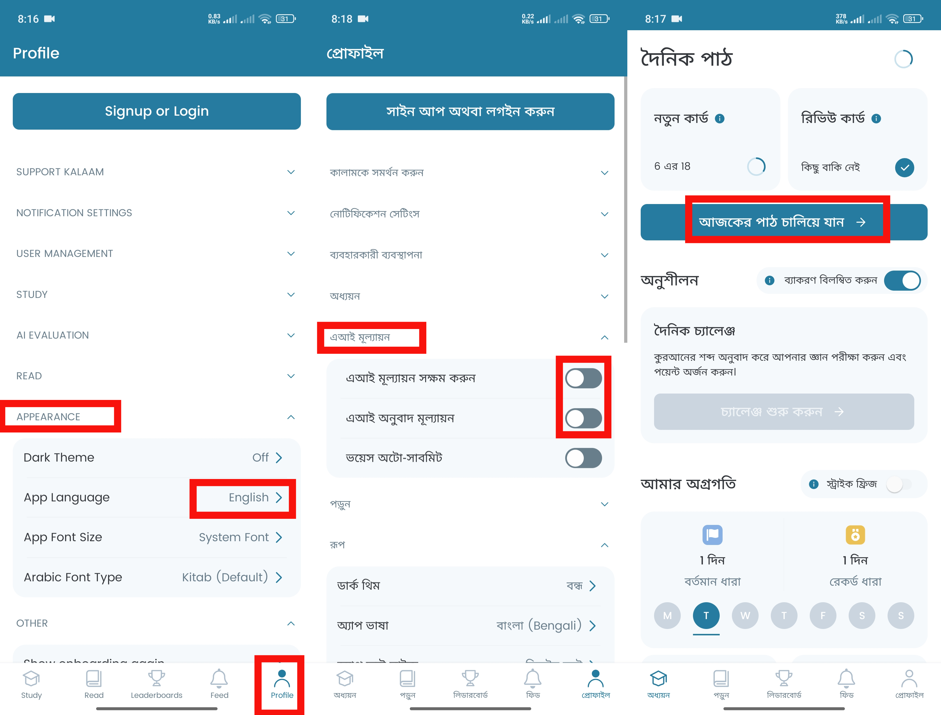 এখন আপনি চাইলে শেখা স্টার্ট করে দিতে পারেন তবে তার আগে নিচের মতো সেটিংস করে নিতে পারেন। প্রথমত বাংলায় শিখতে চাইলে প্রোফাইল থেকে অ্যাপেয়ারেন্সে গিয়ে ভাষা পরিবর্তন করতে পারেন। যারা ইংরাজিতে অভিগ্য তাদের বলবো ইংরেজিতেই শিখেন। আর আমি রেকমেন্ড করবো এআই ফিচার গুলো বন্ধ করতে।