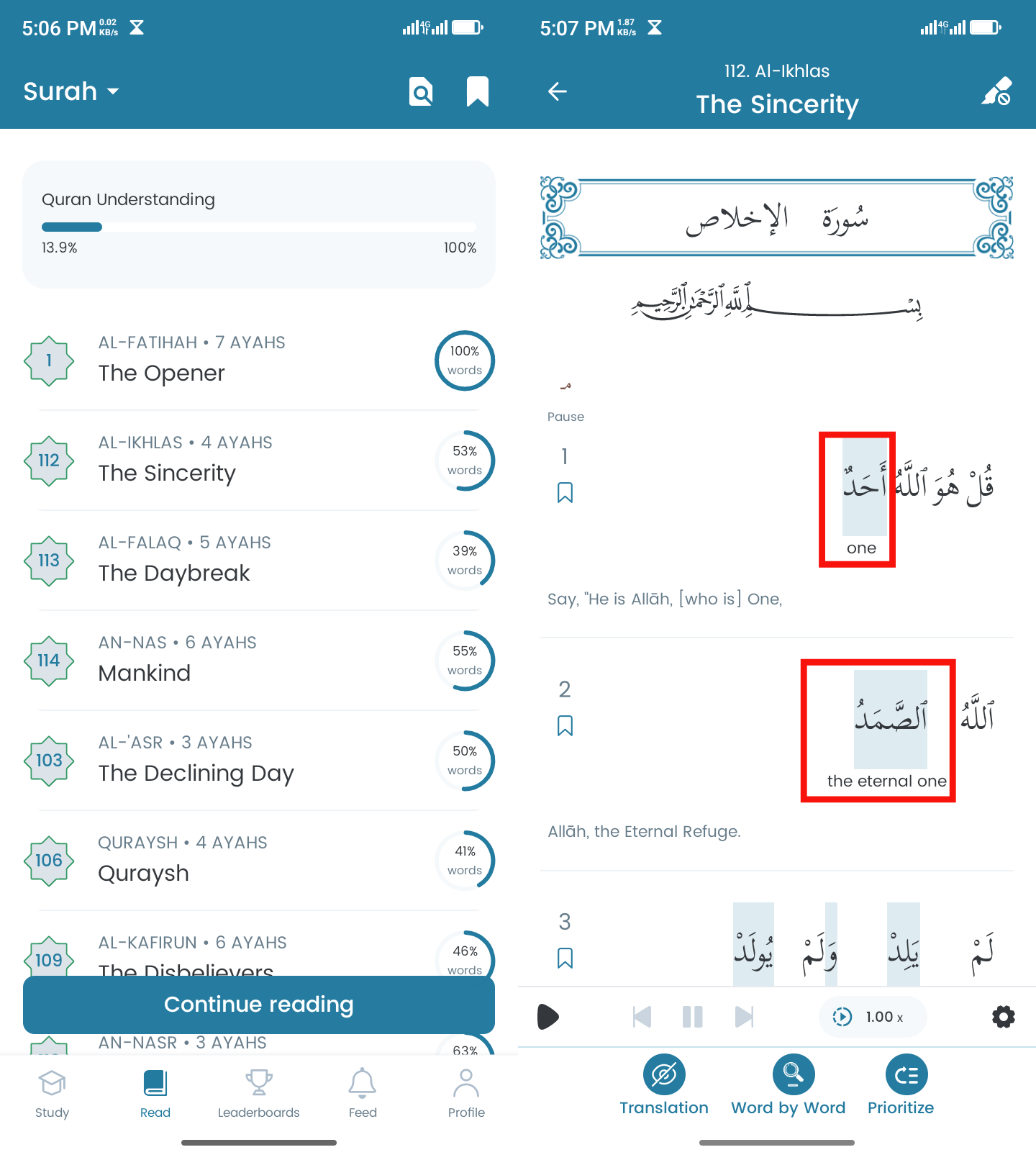 এখানে নিচে দেখুন, রিড সেকশনে কয়েকটি সুরা এর পারসেন্টেন্স দেখা যায়। এখানে আমি মাত্র ৭০ টা শব্দ জানা হিসেবে মার্ক করেছি যেগুলো আমার ইতিমধ্যে শেখা আছে। আর এখান থেকে যখন আপনি সুরা পরবেন তখন এই অ্যাপ শুধুমাত্র সেসব শব্দের অর্থ দেখাবে যেগুলো আপনি জানেন না। এতে করে অজানা শব্দগুলোর অর্থ জেনে নিজে নিজেই যাতে অনুবাদ করা যায়।