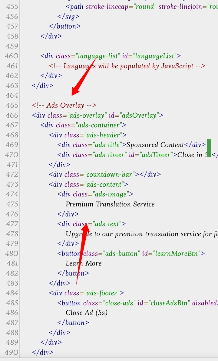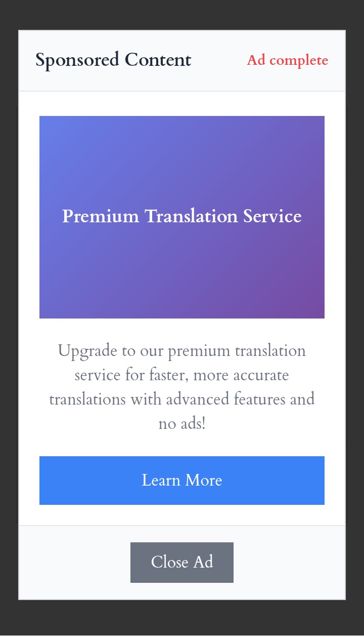 14. Ads সিস্টেম: Translate এ ক্লিক করলে প্রথমে Ads conteiner আসবে তারপর ৫ সেকেন্ড পর Ads close করলেই Api request যাবে!