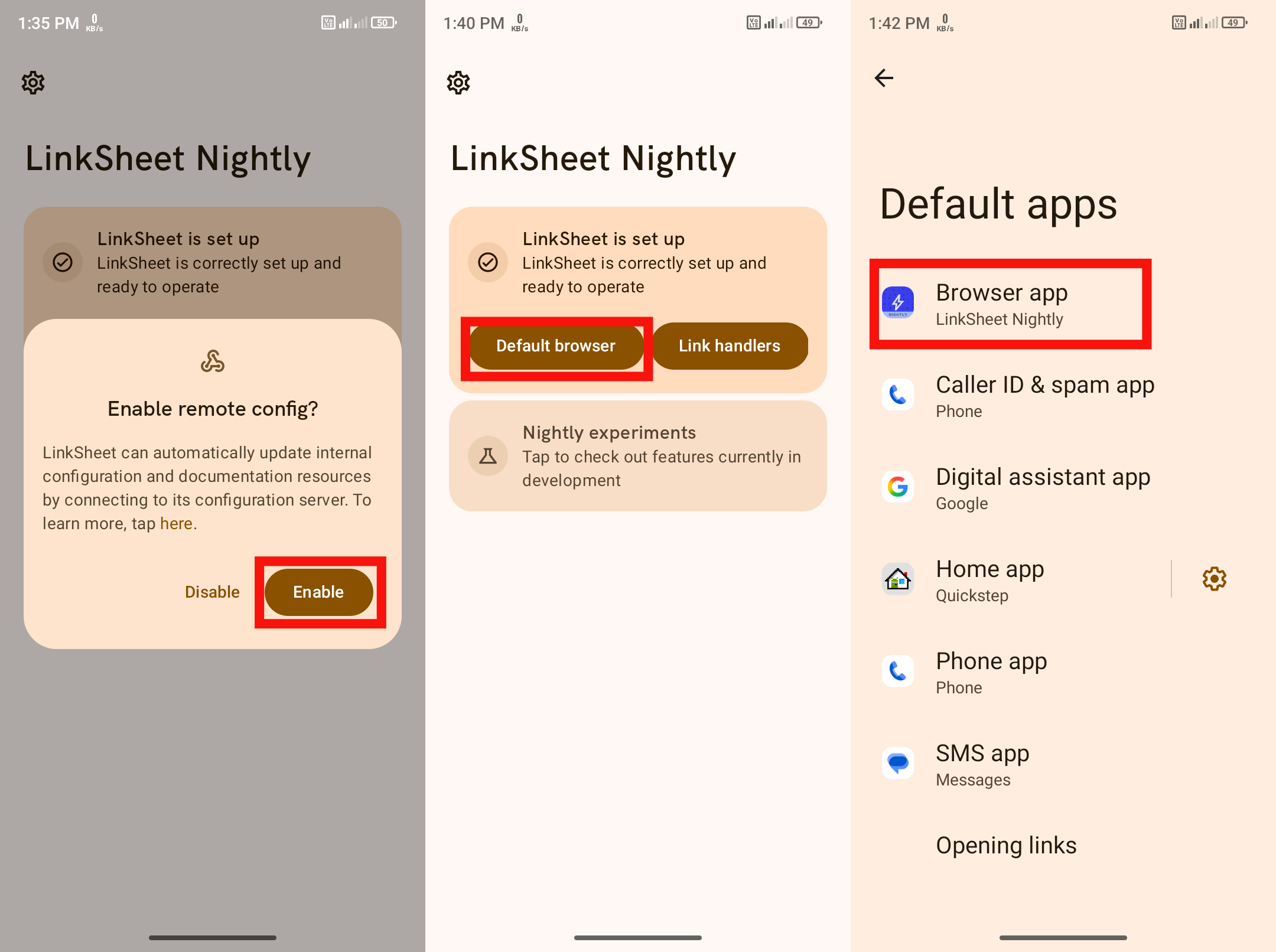 অ্যাপ ওপেন করার পরে Eneble remote config? নামের একটি অপশন আসবে সেটা এনাবল করে দিবেন। চাইলে ডিস্যাবলও করতে পারেন আপনার ইচ্ছা। এবার ডিফল্ট ব্রাউজার অপশনে ক্লিক করুন এবং লিংকশীট