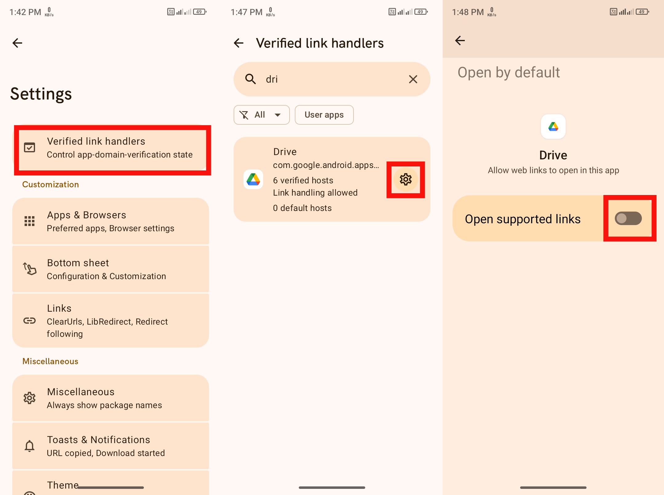 আমি গুগল ড্রাইভ অ্যাপ সার্চ করলাম। এবার অ্যাপ এর নাম এর পাশে সেটিং গিয়ারে ক্লিক করুন । Open Supported Link অপশনে ক্লিক করে সেটা ডিস্যাবল করে দিন। ব্যাস কাজ হয়ে গেছে।