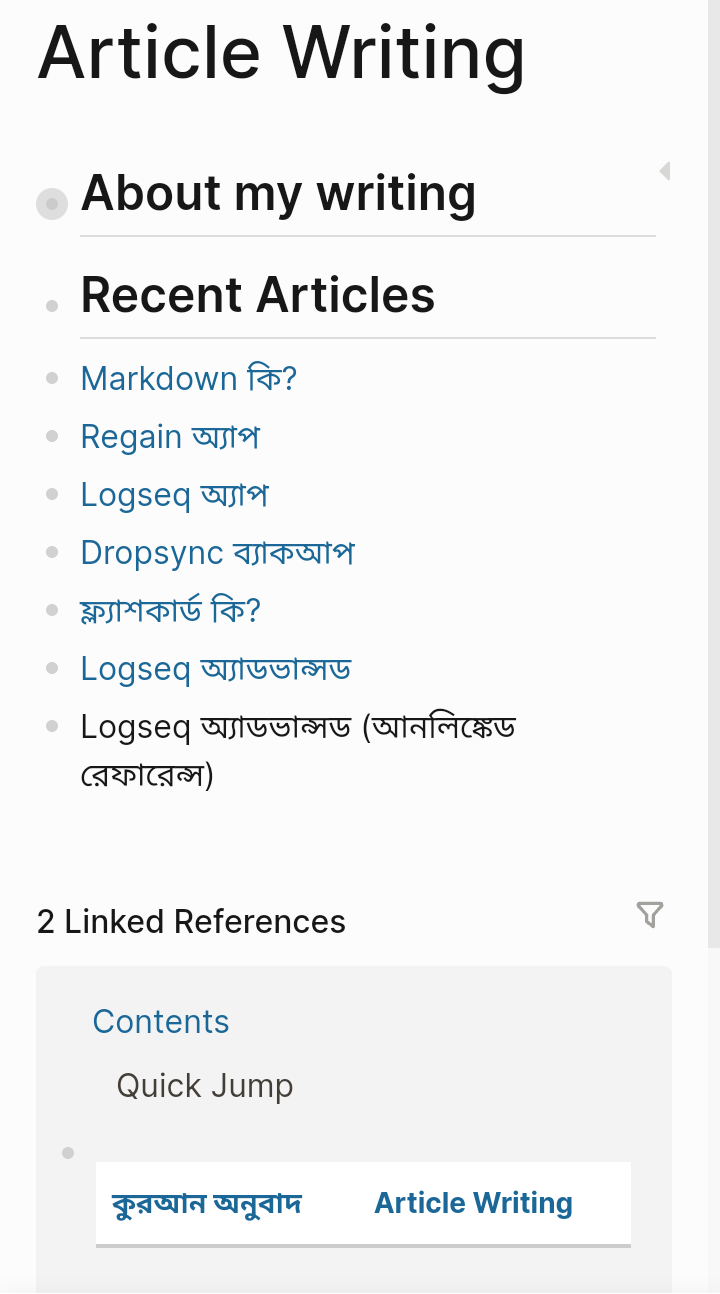 নোট লিঙ্কিং সম্পর্কে আগের পোস্ট’এ বলেছি কিছুটা। লগসেক এর সবচেয়ে পাওয়ারফুল ফিচার এটি। আপনি যেকোন বিষয়ে লিখুন। লিখতে লিখতে যদি এমন কোন শব্দ আসে যেটা সম্পর্কে পরবর্তিতে লিখতে পারেন তবে জাস্ট [[]] দুইটা থার্ড ব্রাকেট ব্লক এর মধ্যে লিখুন সেই শব্দ টা। র্যান্ডম ভাবে কোন পেজ তৈরি না করে বিষয় ভিত্তিক ধারাবাহিক ভাবে এগোন। যেমন আমার ক্ষেত্রে যদি বলি তবে, আমি Logseq দিয়েই ট্রিকবিডির সকল আর্টিকেল লিখে থাকি। তো নতুন কোন আর্টিকেল লিখার জন্য ডিরেক্টলি কোন পেজ তৈরি না করে ধারাবাহিকতা বজায় রেখে প্রথমে একটা পেজ তৈরি করলাম “Article Writing” এই নামে। এর পরে এখানে একে একে লিঙ্ক লিস্ট বানালাম। এতে আমার লেখা কোন আর্টিকেল খুজে পেতে কোন বেগ পেতে হবে না।