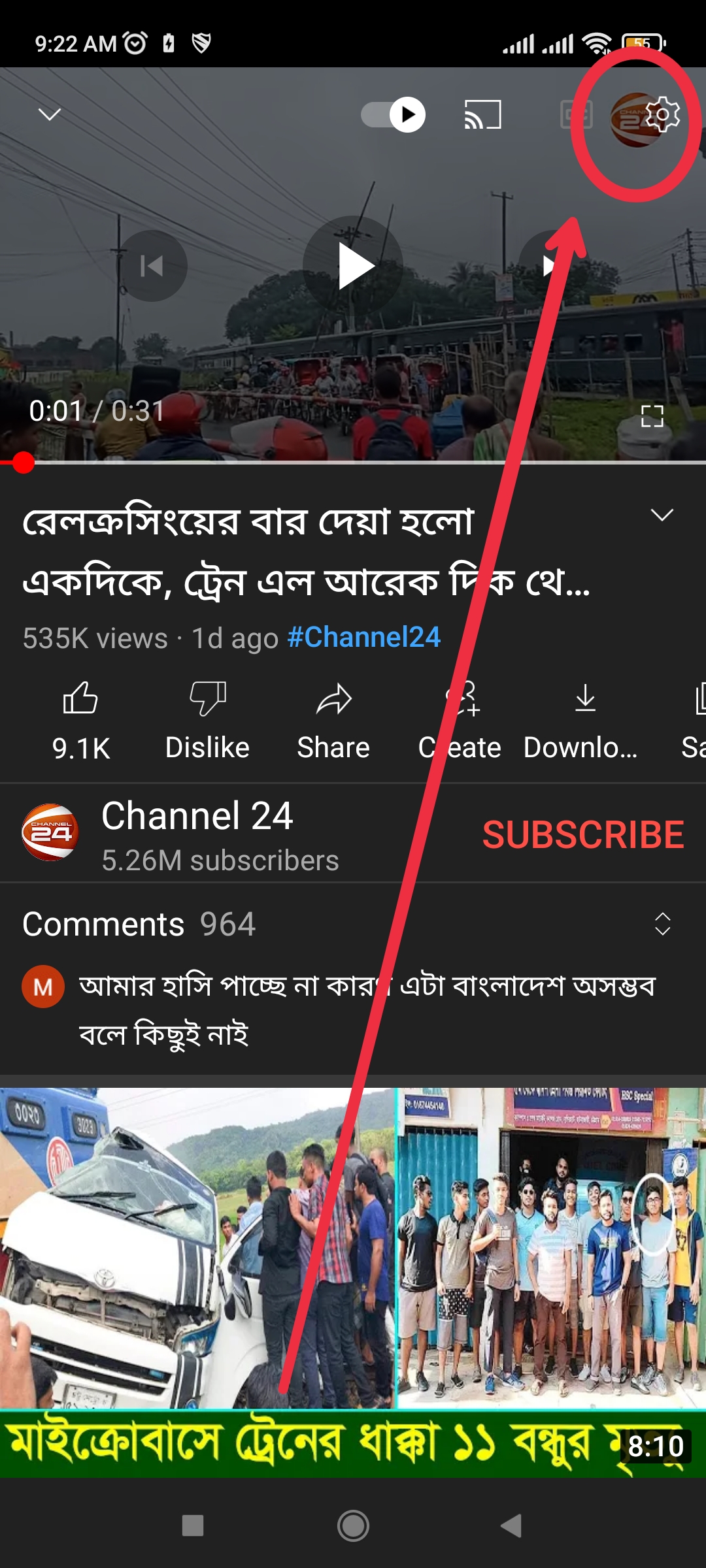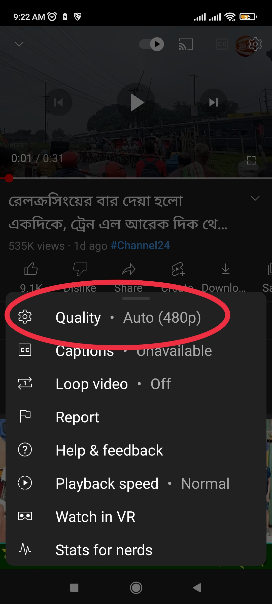 এরপর যেই সেটিং টি দেখবো সেটি সব সময়ের জন্য নয়। ধরে নিন আপনার ফোনে একান্তই এমবি কম কিন্ত আপনি ইউটিউব একটি ভিডিও দেখতে পারেন। সেক্ষেত্রে আপনি এই সেটিং টি ব্যাবহার করতে পারেন। এর জন্য যেকোনো একটি ভিডিও প্লে করে পজ করুন। এরপর নিচের দেখানো সেটিং এ ক্লিক করুন।