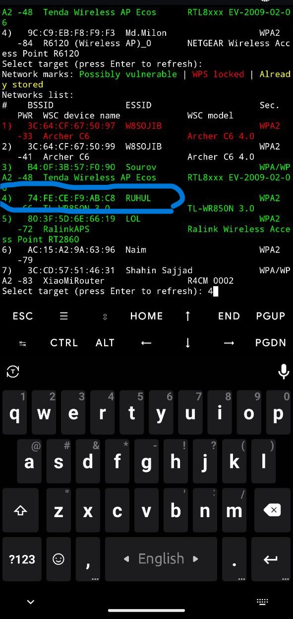 এখানে আপনি দেখতে পাচ্ছেন যে, চার নম্বর ওয়াইফাইটির নাম ‘RUHUL’। আমি ওই ওয়াইফাইটি হ্যাক করতে চাই, তাই আমি এখানে ‘4’ লিখবো।
