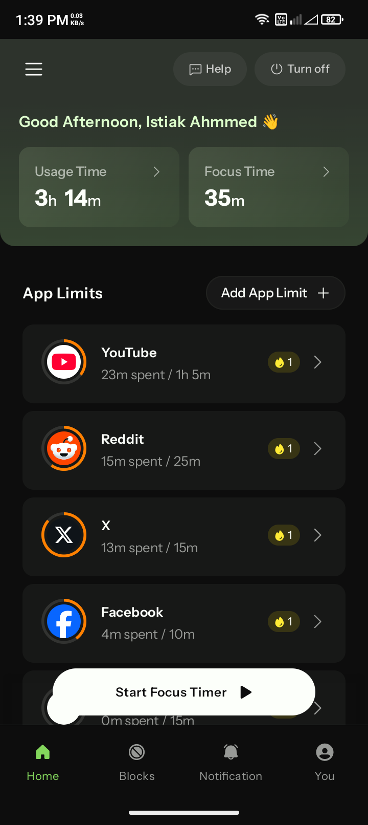 - স্ট্রেক (Streak): এতে আছে স্ট্রেক সিস্টেম। যেটা আপনাকে কোন অ্যাপের লিমিট পার হয়ে যাওয়ার পর সে অ্যাপ পুনরায় ব্যবহার না করতে মোটিভেট করবে।