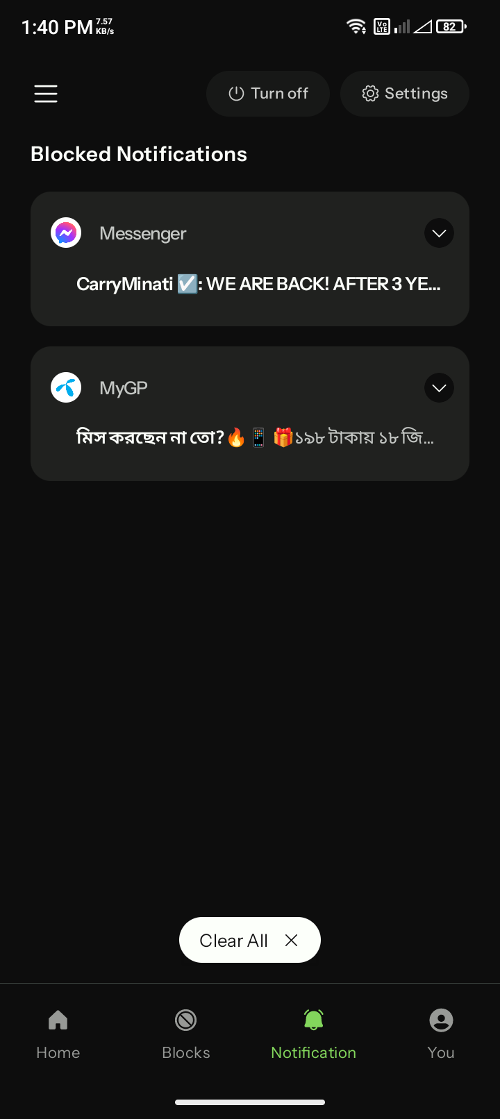 - নোটিফিকেশন ব্লক: আছে নোটিফিকেশন ব্লক এর চমৎকার সুবিধা যা আপনাকে ডিস্ট্রাক্ট হয়ে যাওয়া থেকে বাঁচাবে। নোটিফিকেশন ব্লক করার মাধ্যমে আপনি অপ্রয়োজনীয় অ্যাপ গুলোর নোটিফিকেশন ব্লক করে দিতে পারেন যেটা পরবর্তীতে দিনের কোন এক সময় উক্ত অ্যাপ থেকে একবারে দেখে নিতে পারেন। যেটা আমার পার্সোনাল অভিজ্ঞতা অনুযায়ী অনেক উপকারী একটি ফিচার।