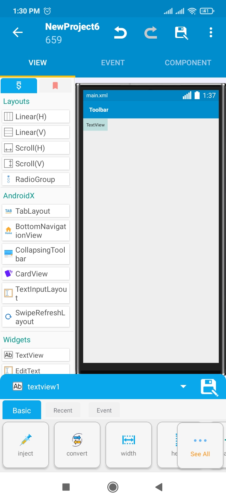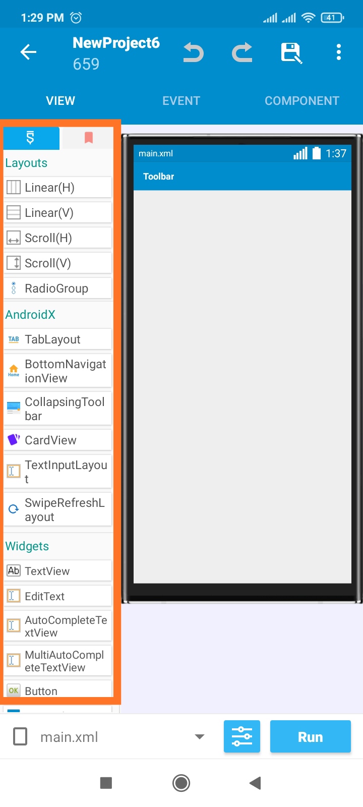 যদি বোতাম ক্লিক, স্ক্রিন লোড, তালিকা আইটেম ক্লিক ইত্যাদি ইভেন্টে কাজ করতে চান, EVENT ট্যাবে গিয়ে ব্লক কোড বসাতে হয়। উদাহরণ হিসেবে একটি বাটনে টোস্ট দেখানোর লজিক: