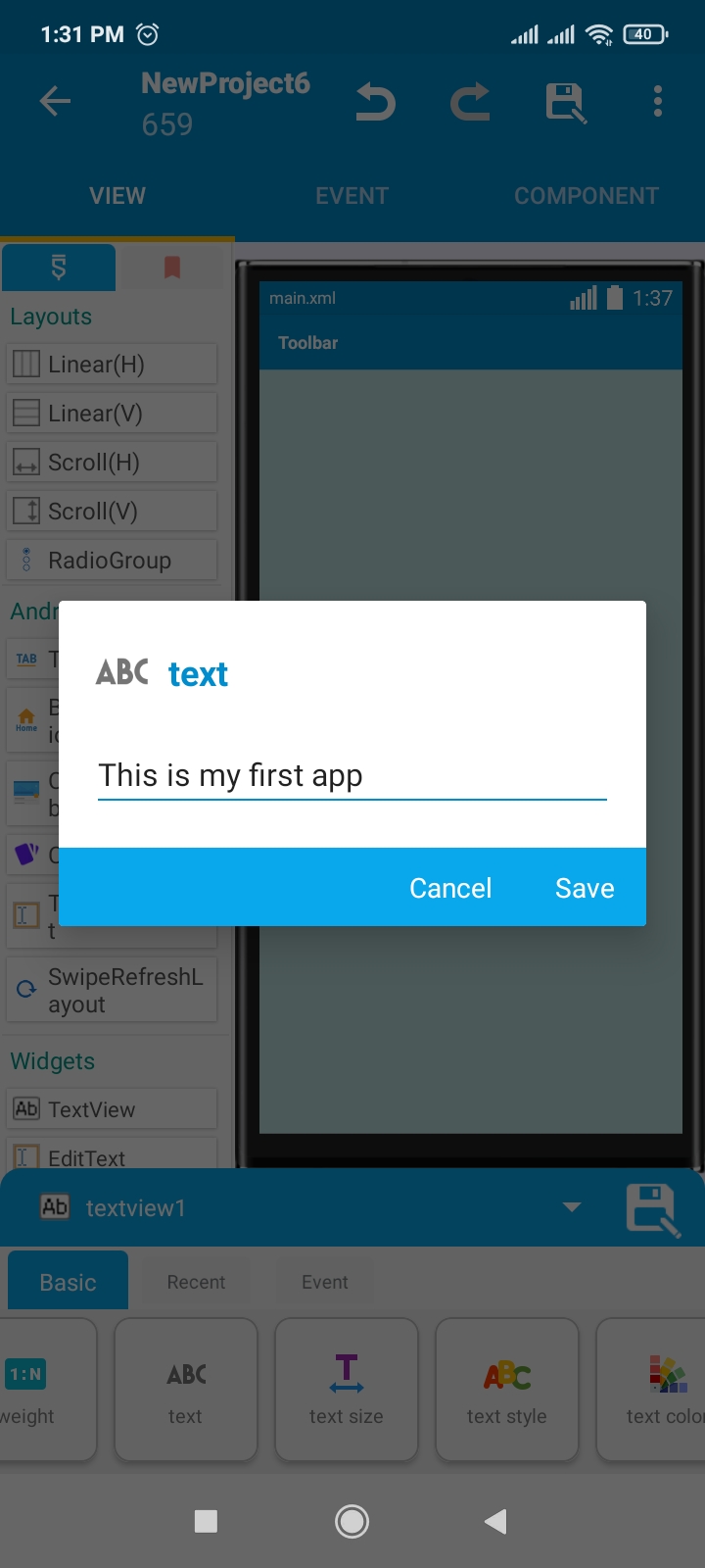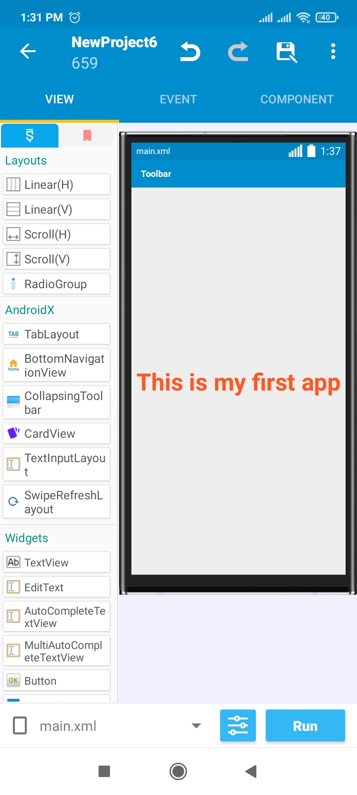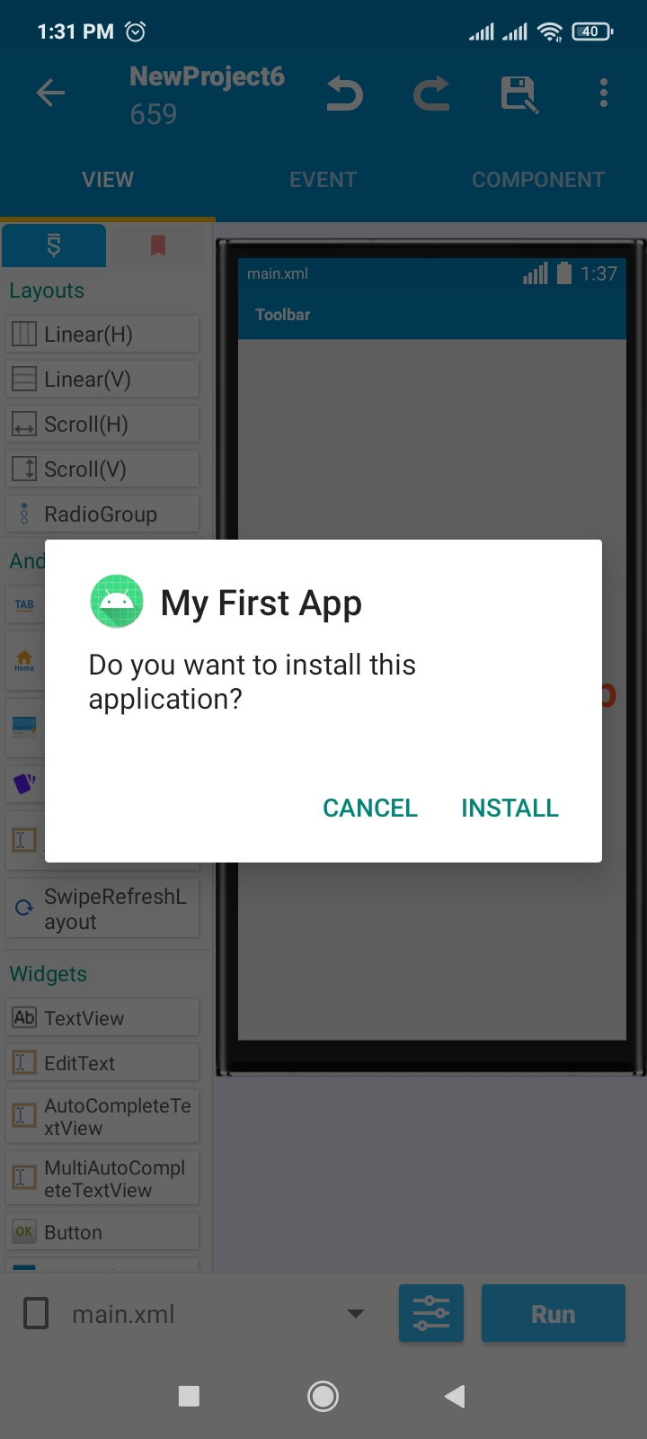 বিল্ড শেষ হলে APK ইনস্টল করার প্রম্পট আসবে। ইনস্টল সম্পন্ন হলে অ্যাপ চালিয়ে ফলাফল দেখুন। আপনি VIEW ট্যাবে যেভাবে ডিজাইন করেছিলেন, ঠিক সেই অনুযায়ী UI প্রদর্শিত হবে।