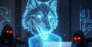 Digital wolf shield protecting laptop from cyberattackers.