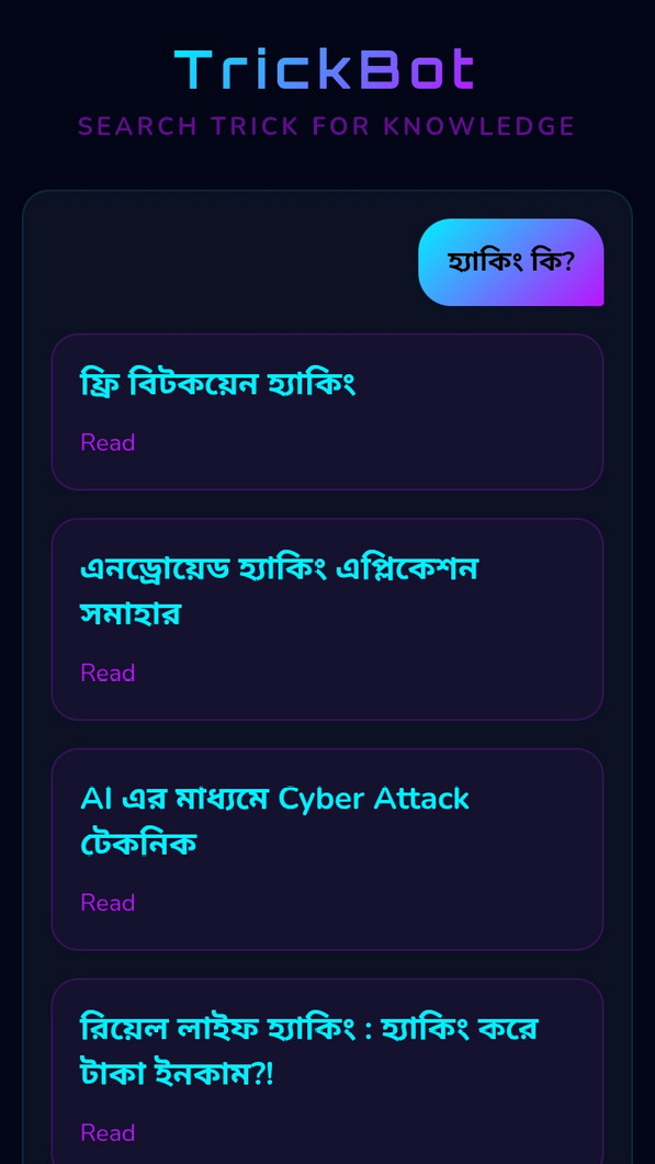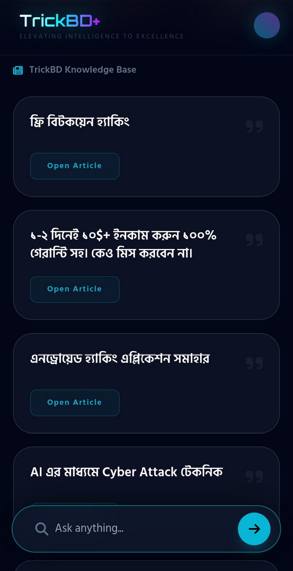 হাইলাইট: এই অংশটির সাথে TrickBD এর সম্পর্ক এমনটা হবে যেন TrickBD এর ইতিপূর্বে সকল আর্টিকেল যা সকল অথরদের Knowledge এবং Trick এর ভান্ডার সেগুলোকে Chunk আকারে ভেঙ্গে ভেঙে একটি Technological Knowledge Base তৈরী করা + যেসব আর্টিকেল নতুন নতুন লেখা হবে সেগুলোও আপডেট হতে থাকবে।