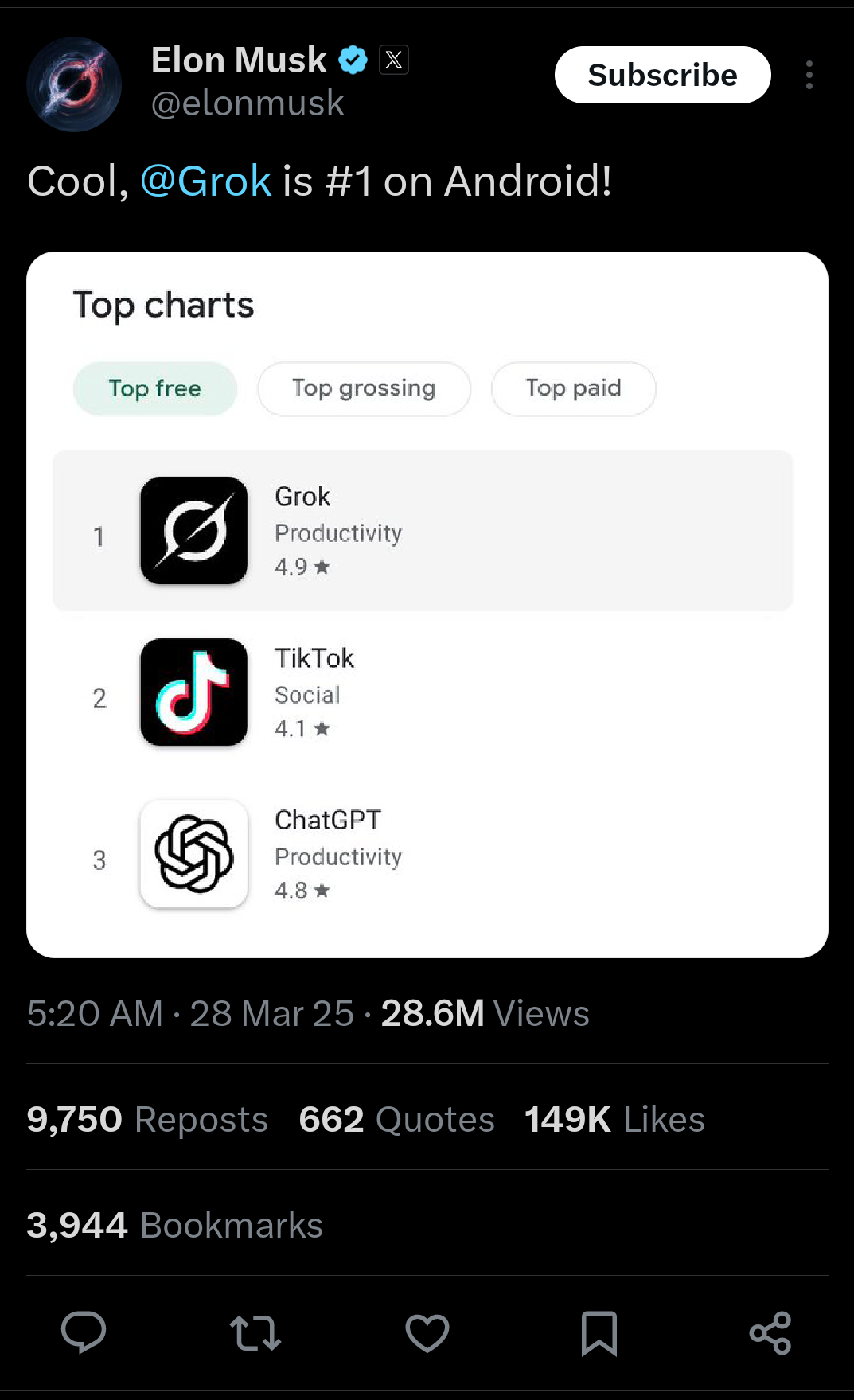 Grok-এর অন্যতম বিশেষত্ব হল এটি একদম মানুষের মত করে উত্তর দেয়। এলন মাস্ক নিজেই একটি স্ক্রিনশট শেয়ার করে বলেন, “Cool, @Grok is #1 on Android!”