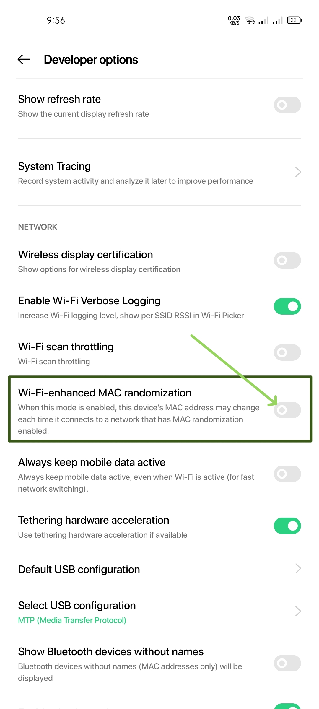 এখন ফোন এর সেটিং থেকে Developer Mode এ গিয়ে ” Wifi enhanced MAC randomisation ” এইটা চলো করো ।
