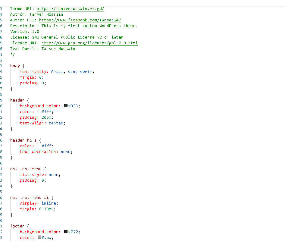 style.css ফাইলে নিচের কোড যোগ করেন, যাতে হেডার আর ফুটারের ডিজাইন সুন্দর দেখায় (মনে রাখবেন নিচের সবুজ রঙের কোড টুকুর পর আপনি বাকি কোড লেখবেন কোনো ভাবেই সবুজ কোড টুকু মুছা যাবে না):